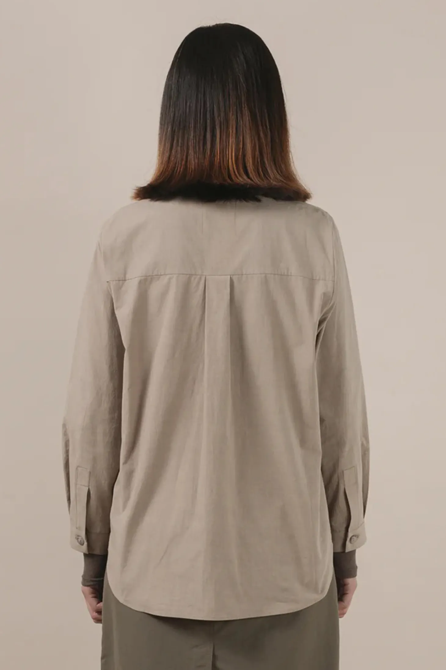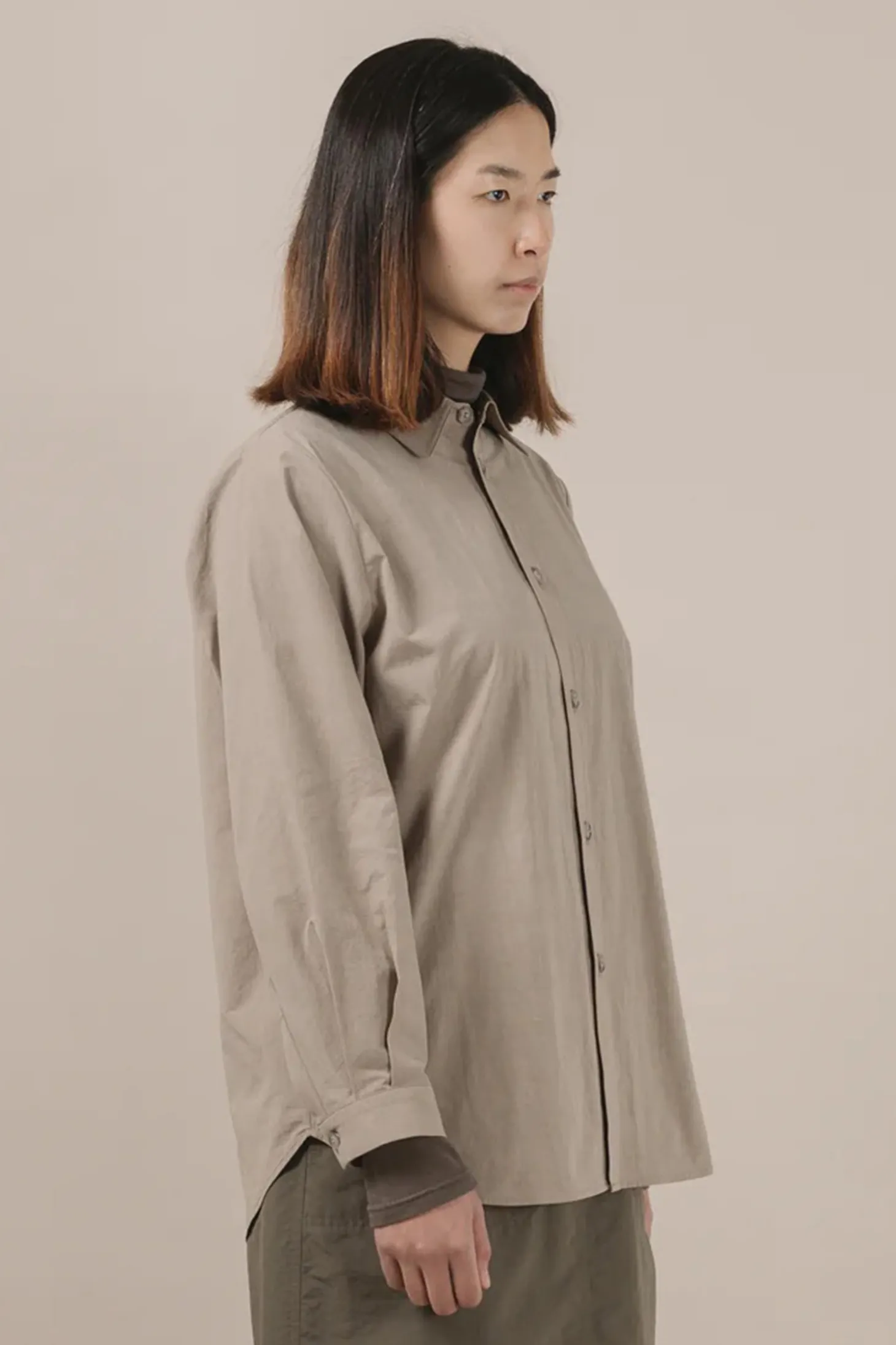 Das Atlashemd hat einen weiten, kastenförmigen Schnitt mit Manschetten und Knöpfen zum Verschliessen.