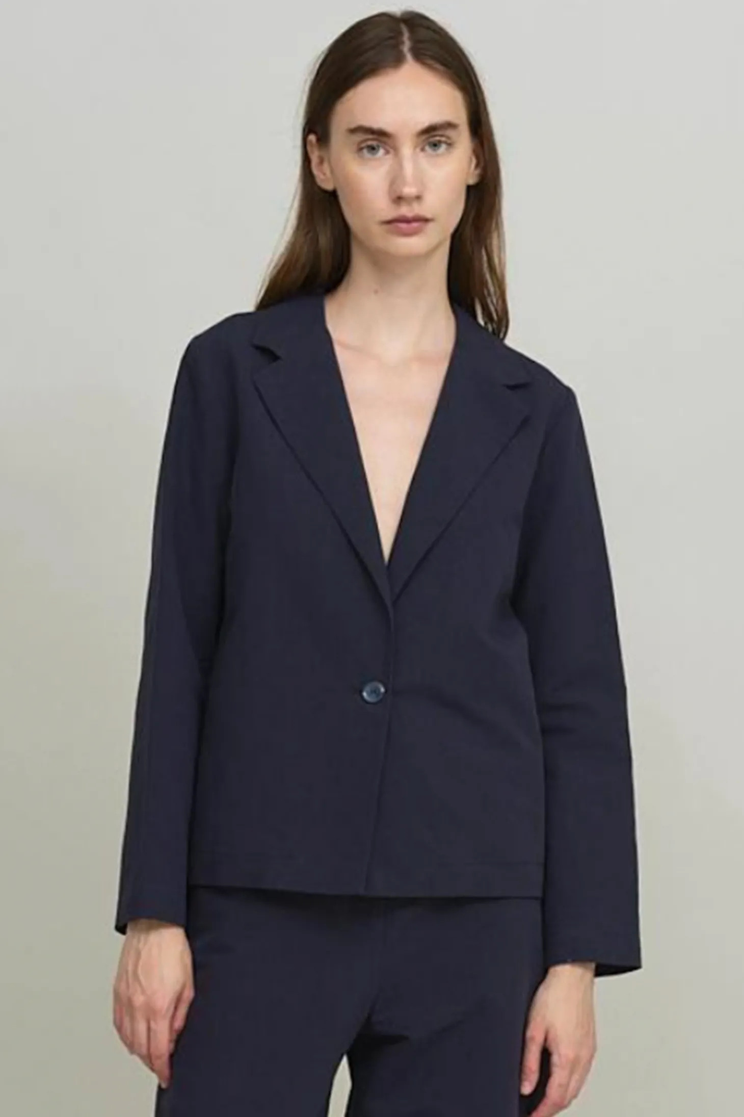 Gerade geschnittener Blazer mit breitem Revers und Knopfverschluss.