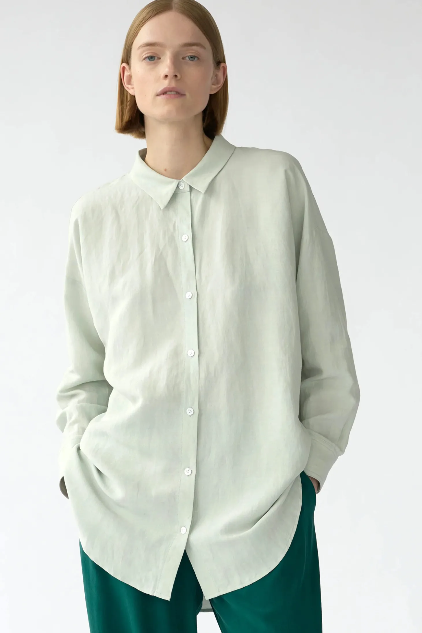 Geknöpftes Oversize-Hemd mit gerader Passform. Mit etwas längerem Rücken, langen Ärmeln und weissen Muschelknöpfen.