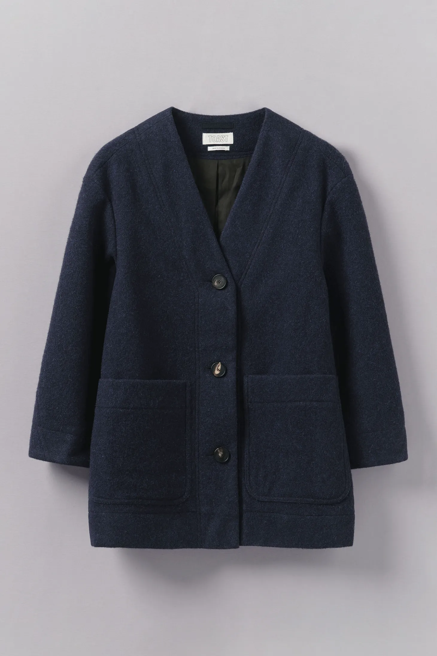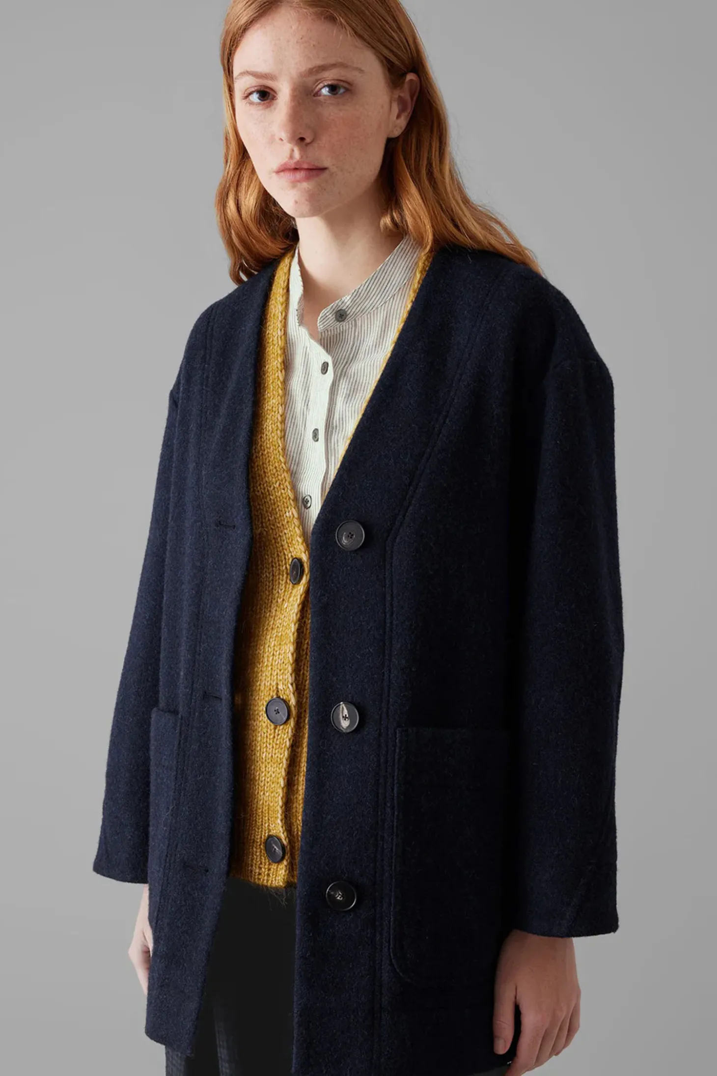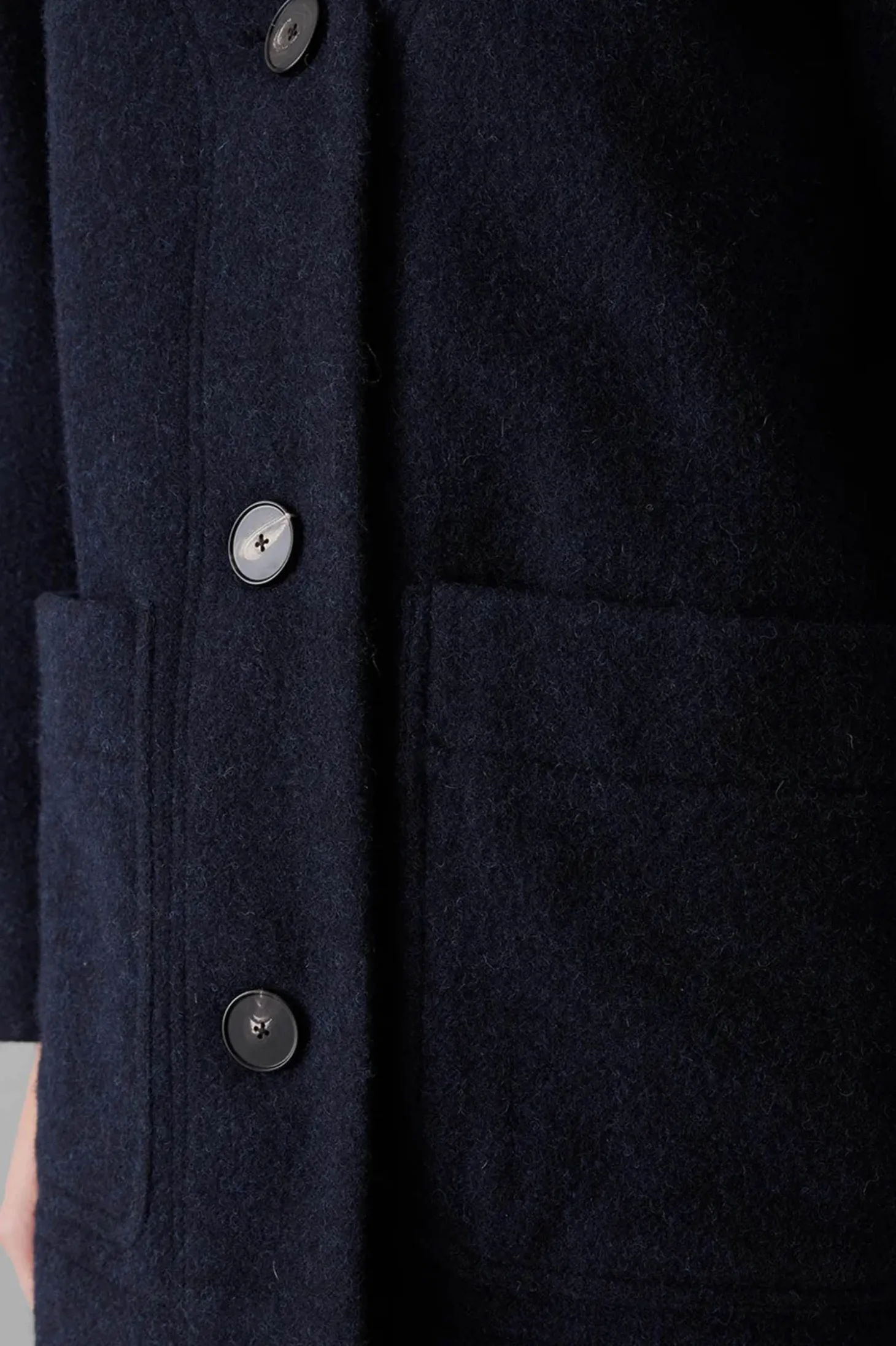 Ein kurzer Mantel mit weiter Passform, V-Ausschnitt und zwei aufgesetzten Taschen. Er besteht aus gekochter Wolle und lässt sich mit drei Knöpfen schliessen.