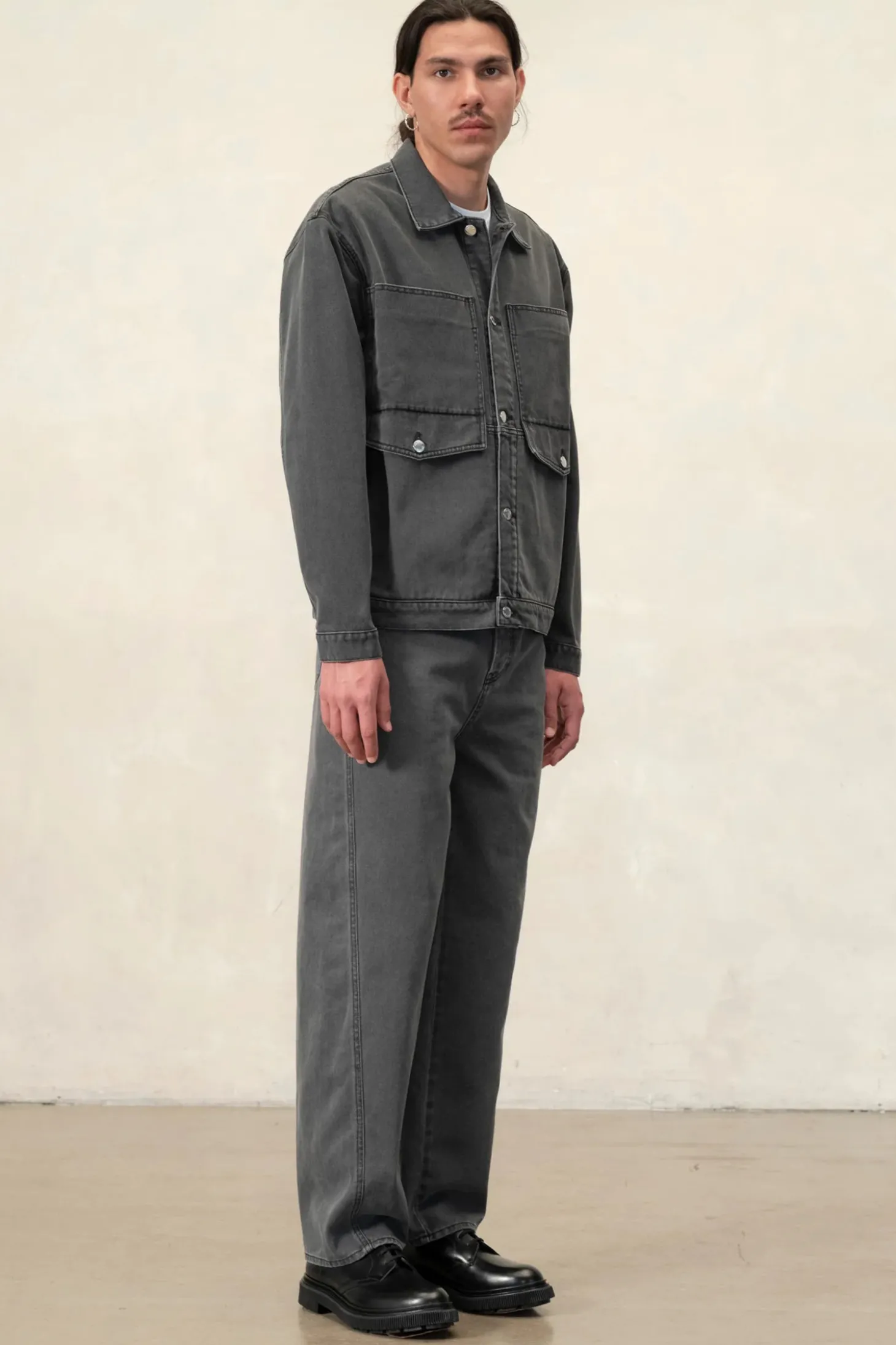 Jacke aus Denim, praktisch und bequem, aus spanischem Bio-Baumwolle-Denim. Inspiriert vom Workwear-Stil, verfügt sie über eine Vielzahl von Taschen: vier aufgesetzte Taschen vorne, zwei Seitentaschen, zwei Innentaschen. Weitere Details: seitliche Laschen, ungefüttert.
