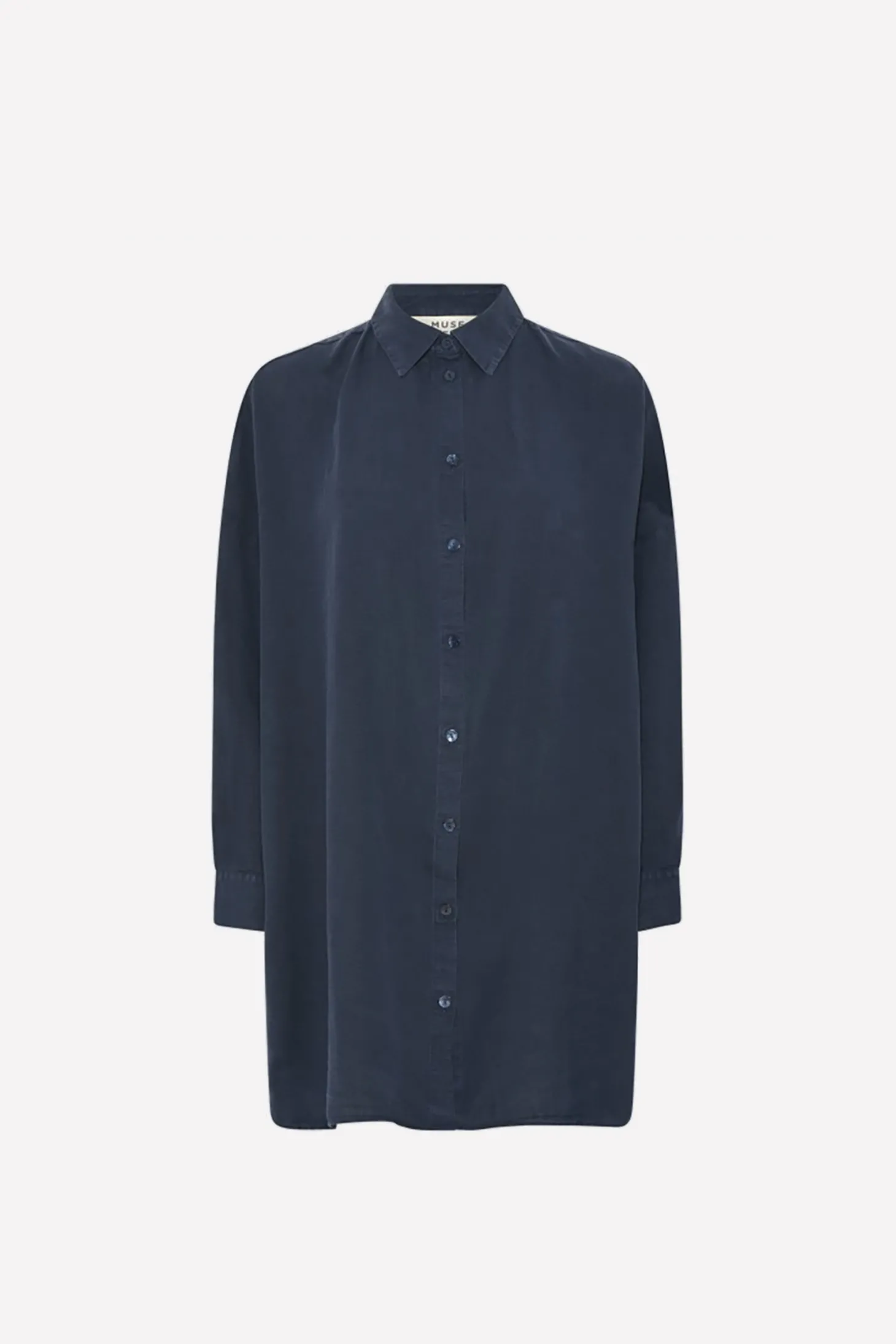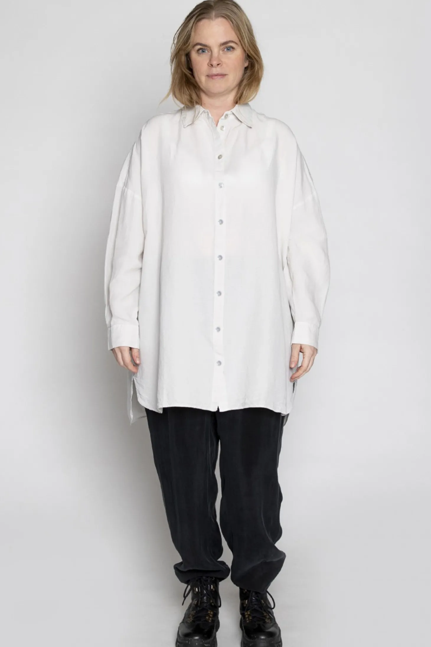 Lange, weite Bluse mit überschnittenen Schultern. Sie ist hinten etwas länger als vorne und wird mit Knöpfen geschlossen.