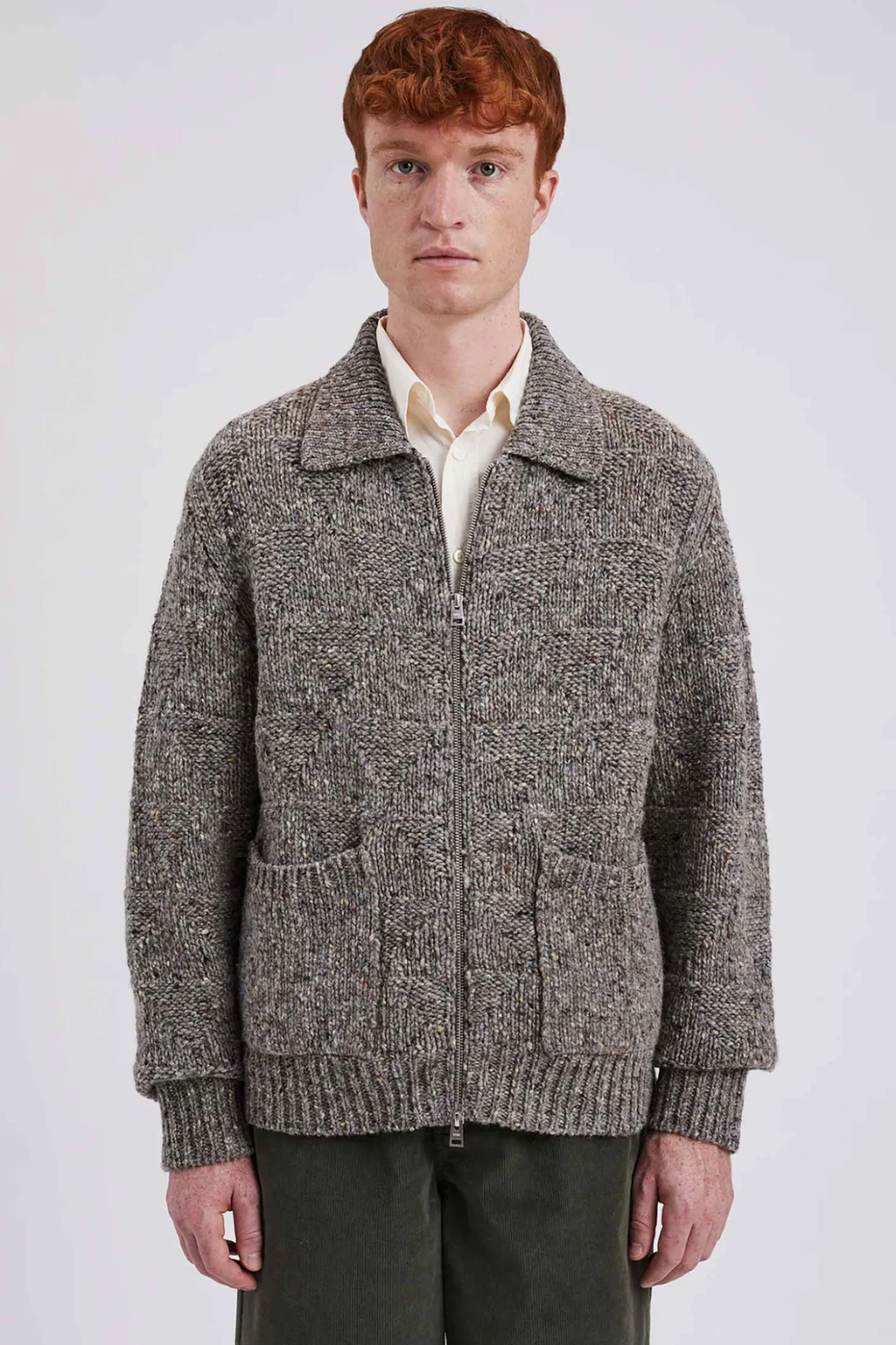 Erik ist eine schwere, kuschlige Strickjacke mit einem Reissverschluss und kleinem Kragen. Er hat Raglanärmel, zwei aufgesetzte Taschen und Rippenbündchen an Ärmel und Saum.