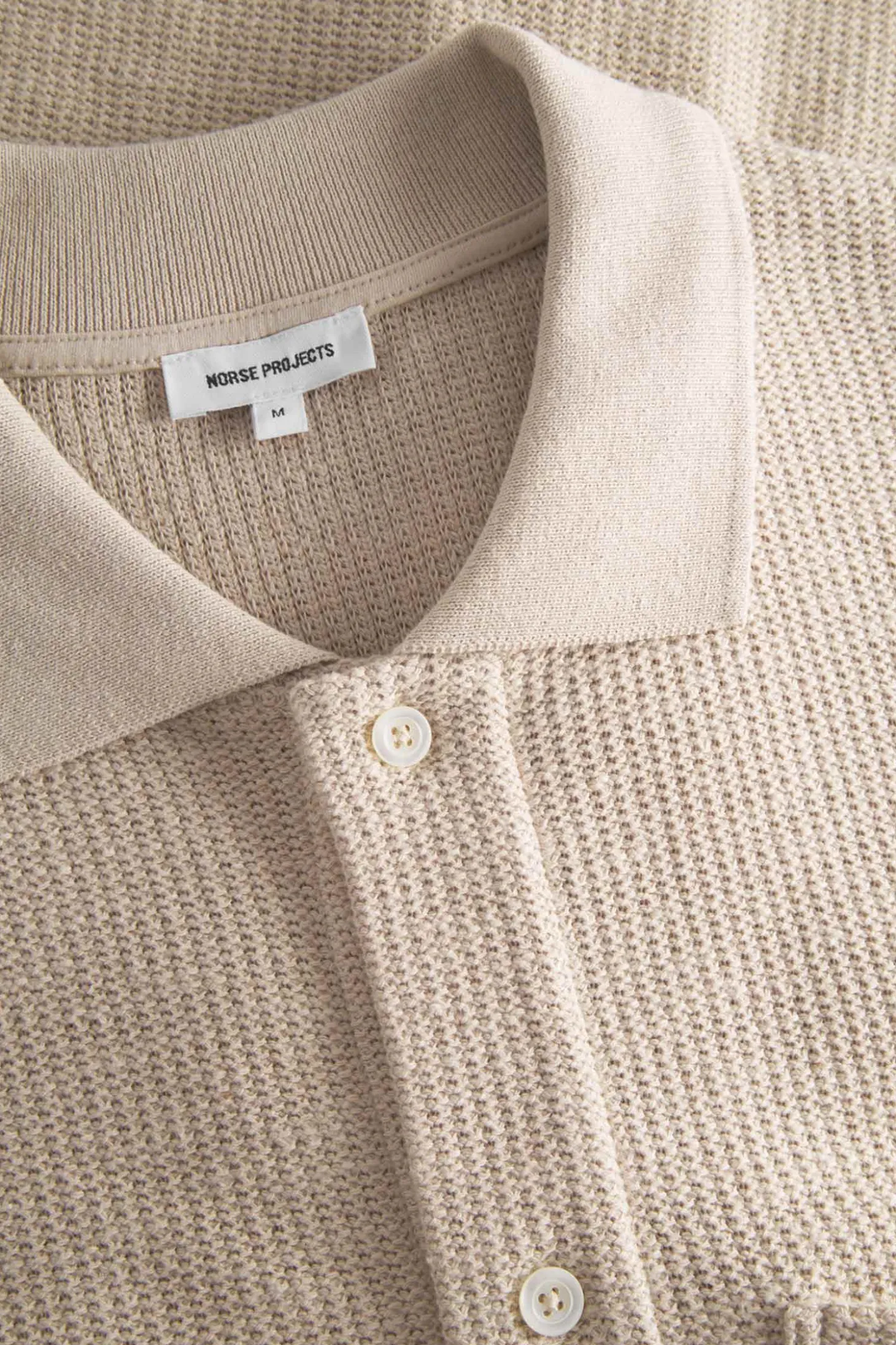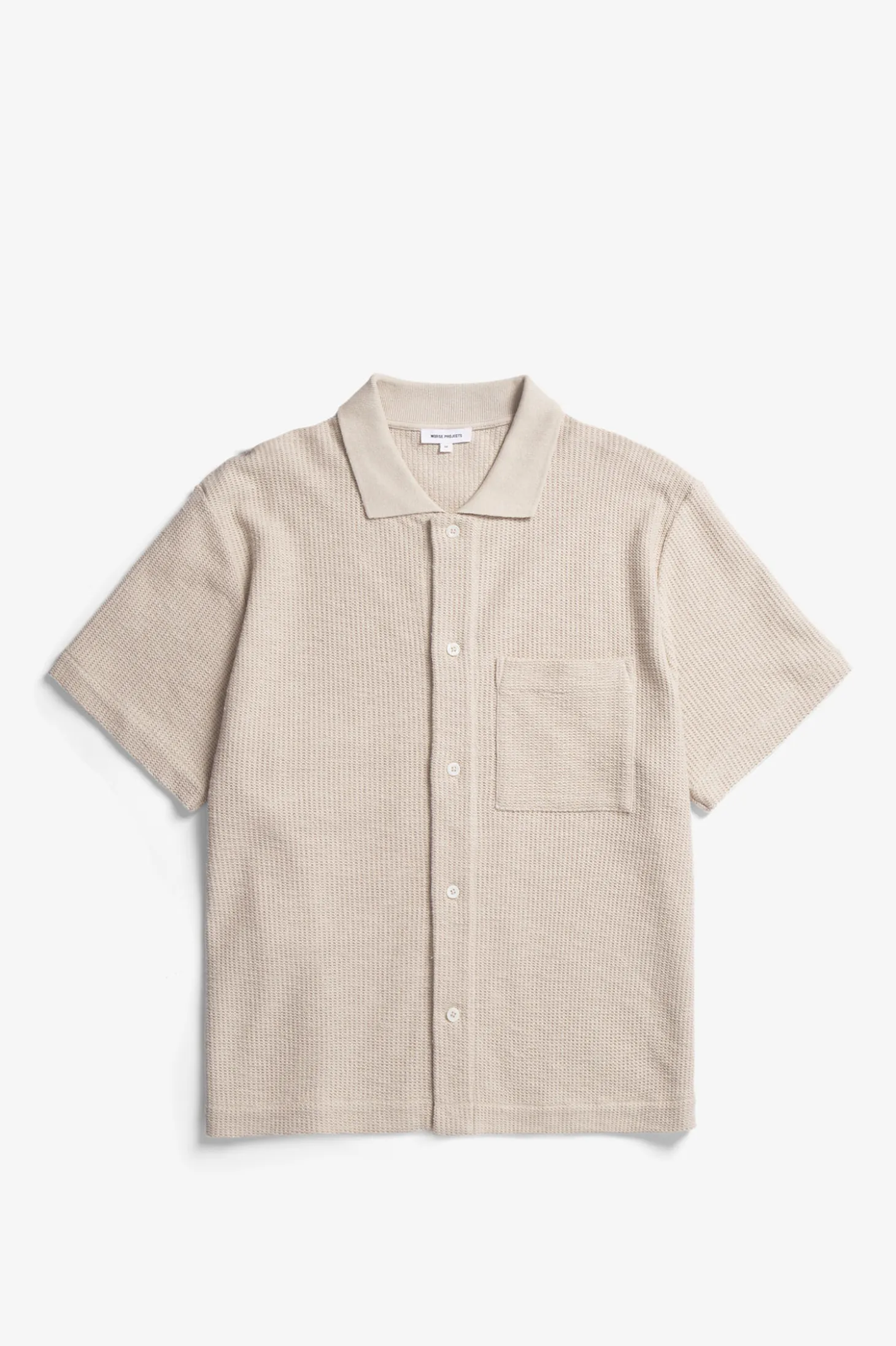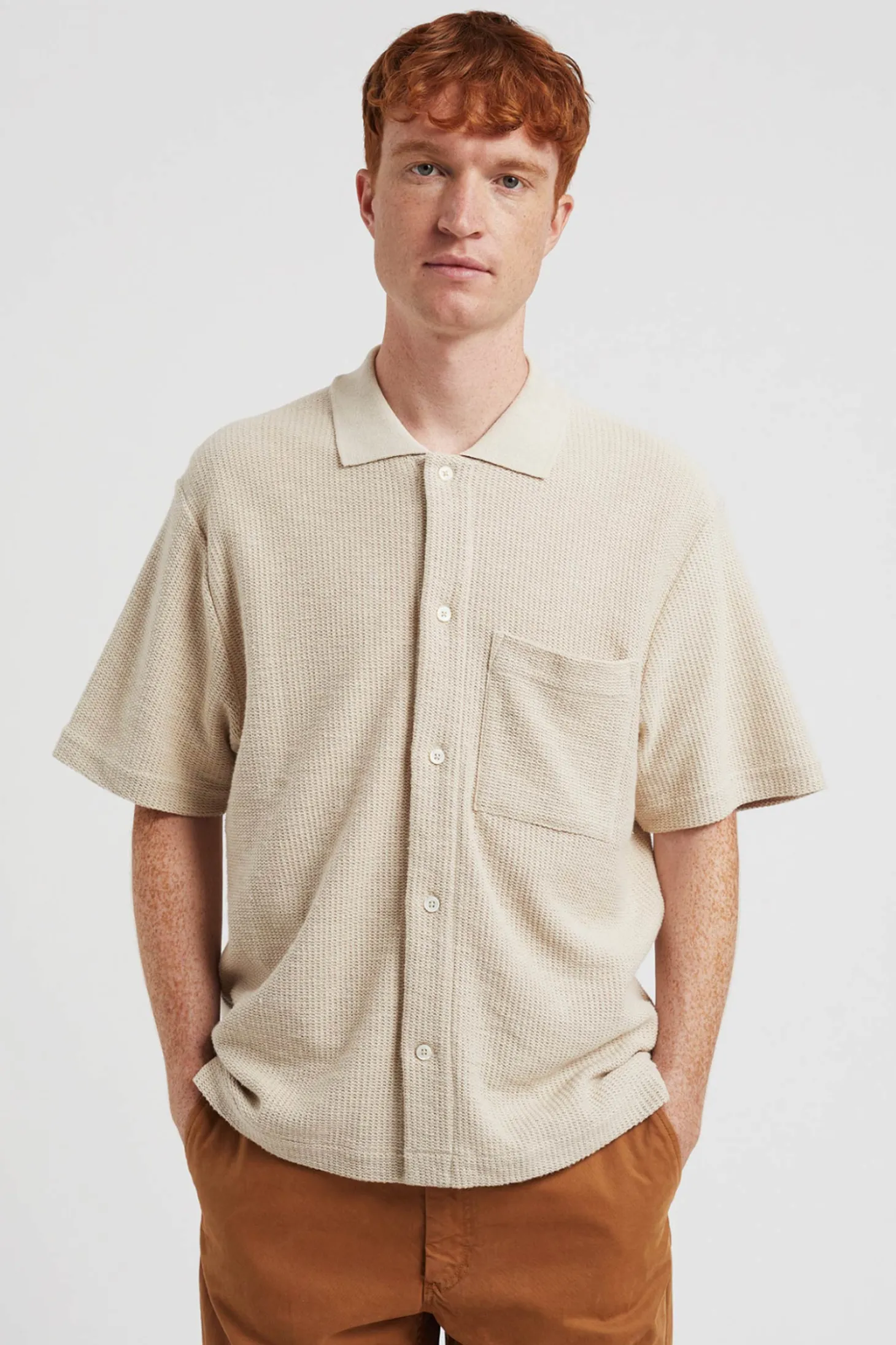 Ein locker sitzendes Kurzarmhemd aus schwerem Jersey mit atmungsaktiver, offener Struktur. Es hat einen gestrickten Kragen, eine Brusttasche und eine Knopfleiste.