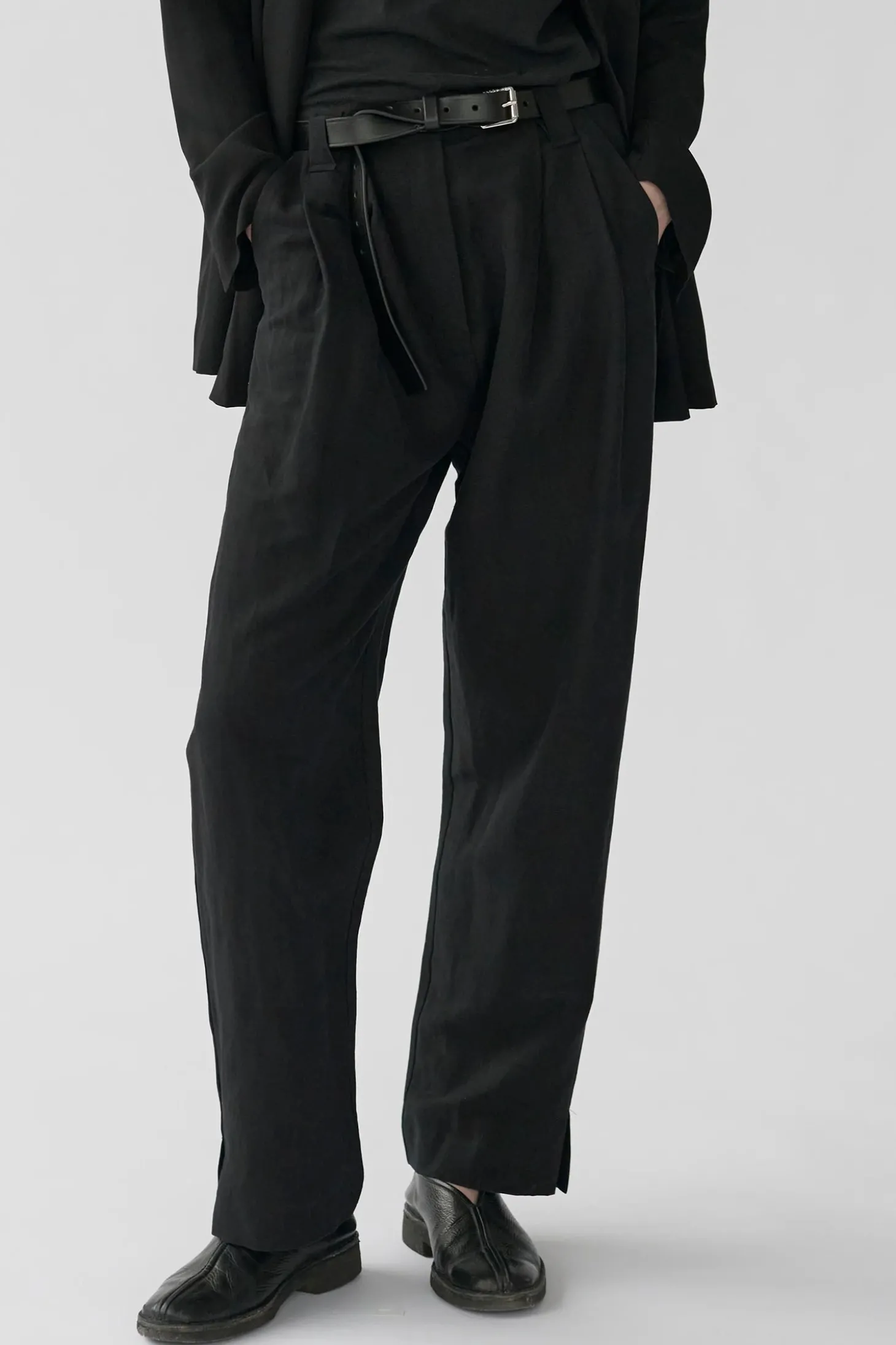 Hoch geschnittene, gerade Hosen mit Reissverschluss, schräge Taschen, elastischem Bund hinten und fliessenden Vorderfalten aus einem schönen Seiden-Leinen-Mix. Leichte Hosen mit hoher Taille und geradem Bein, mit einem elastischen Bund auf der Rückseite, Seitentaschen, Falten an der Vorderseite und einem kleinen Schlitz am Beinende.