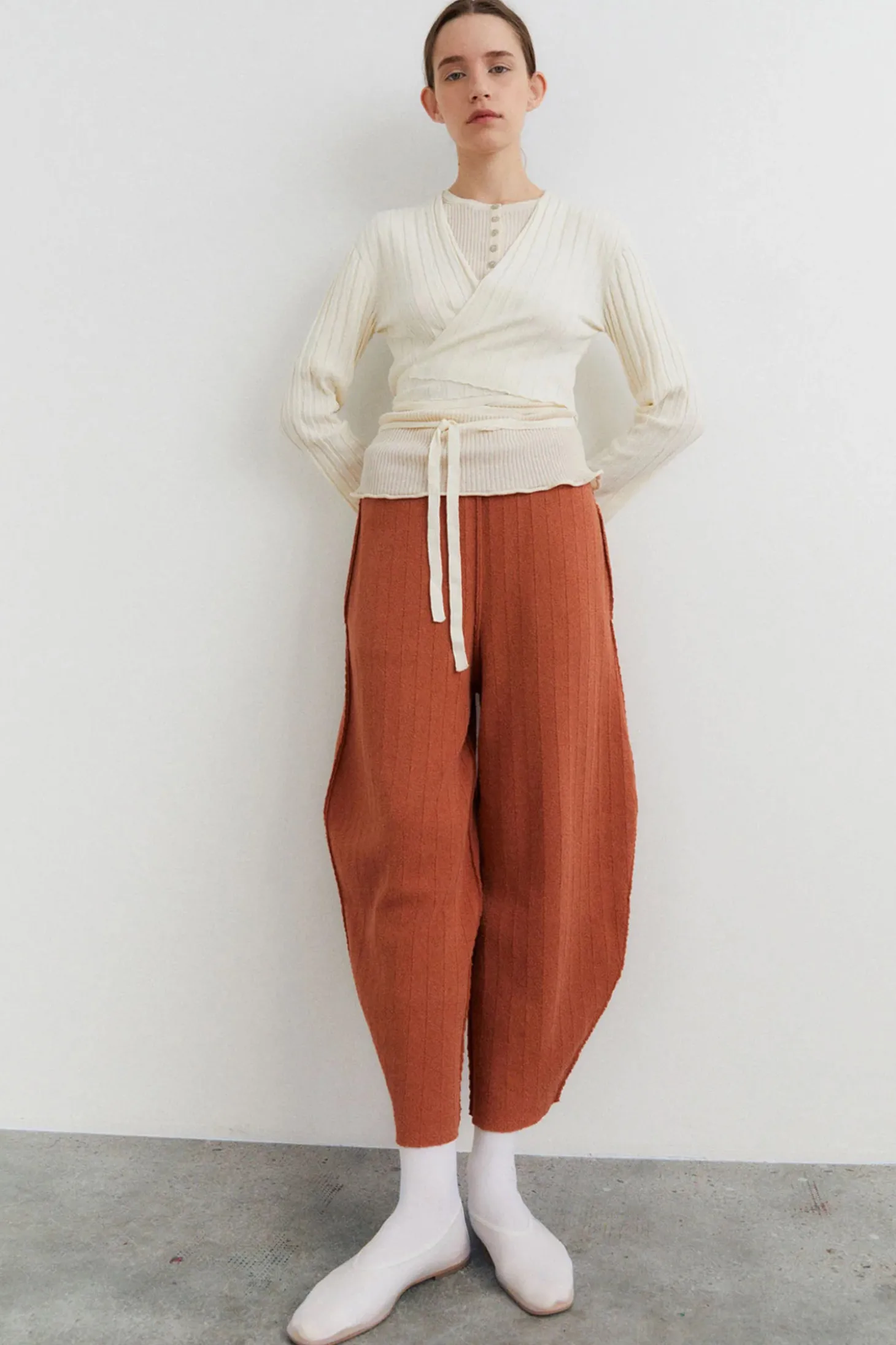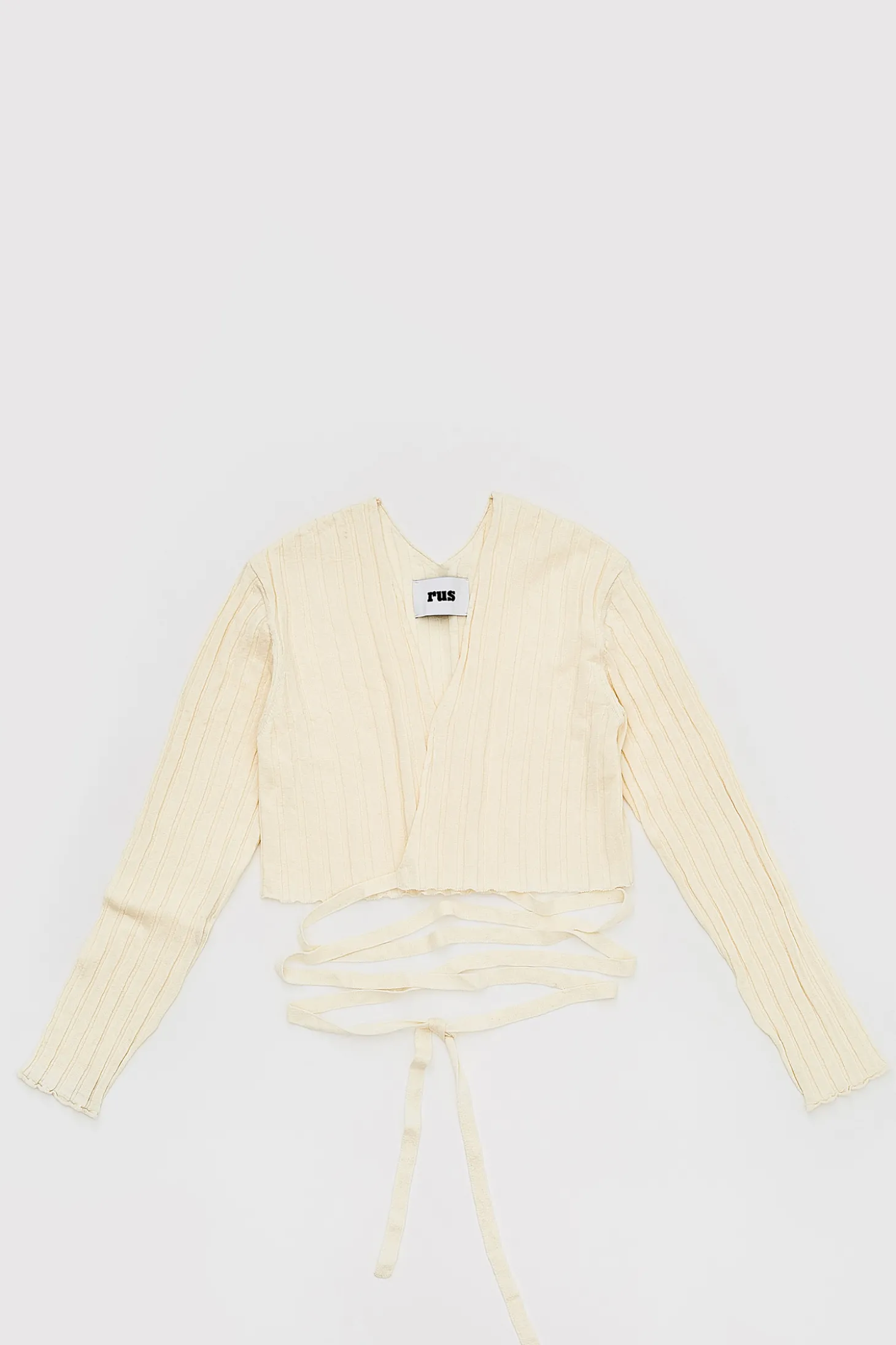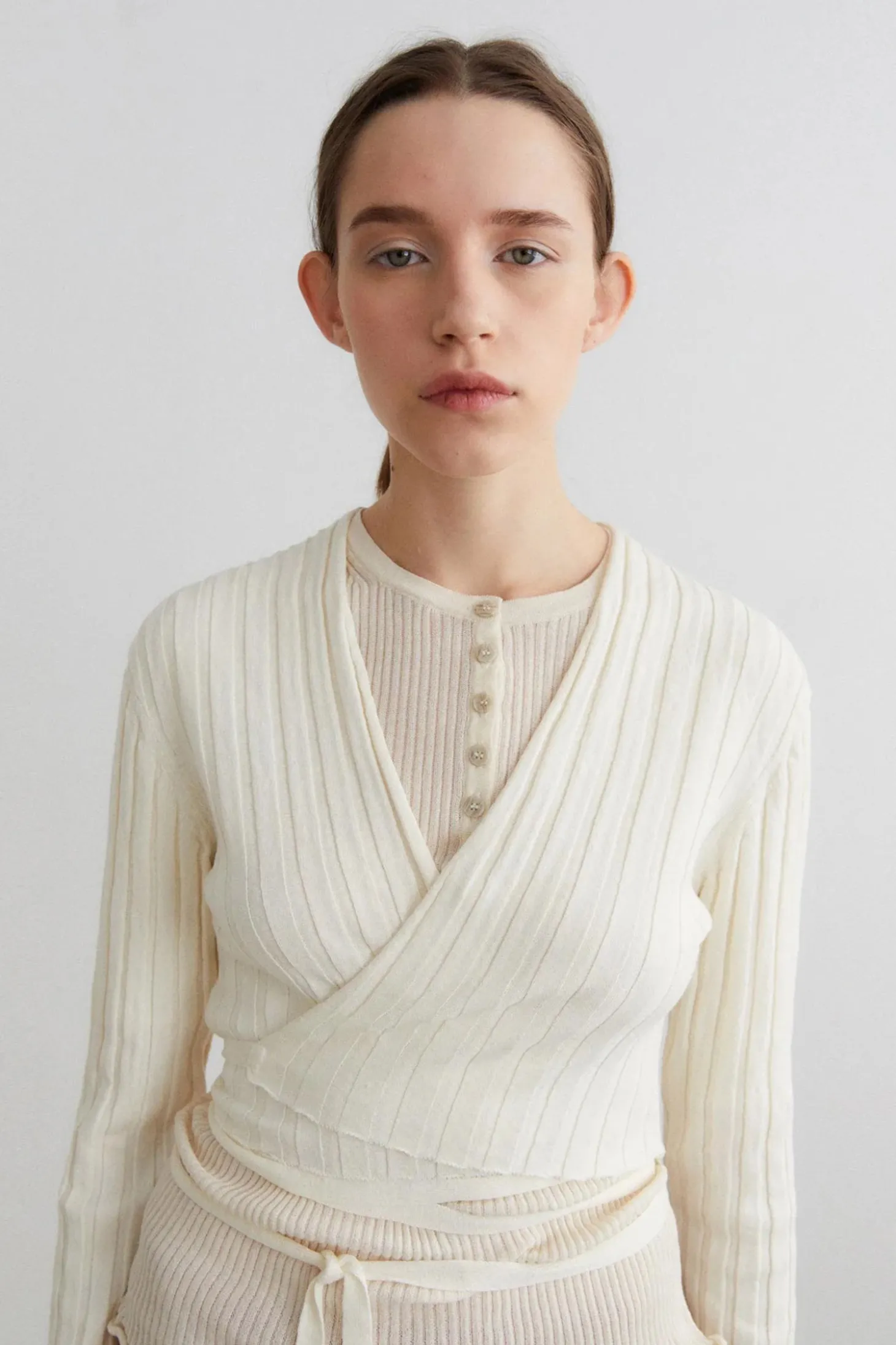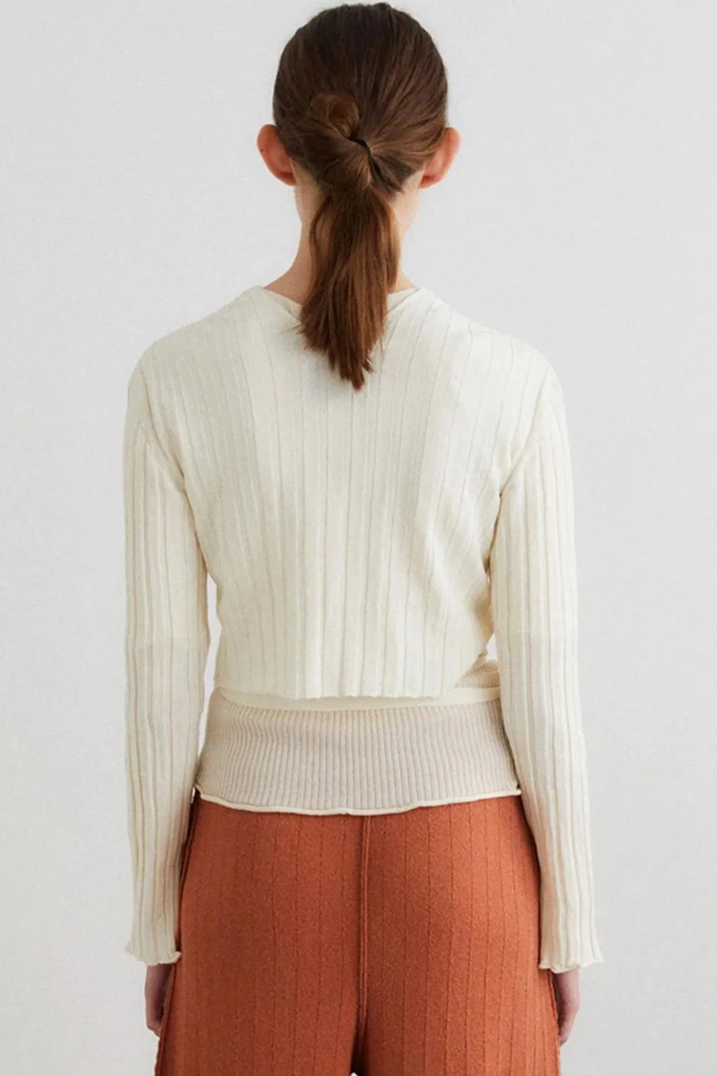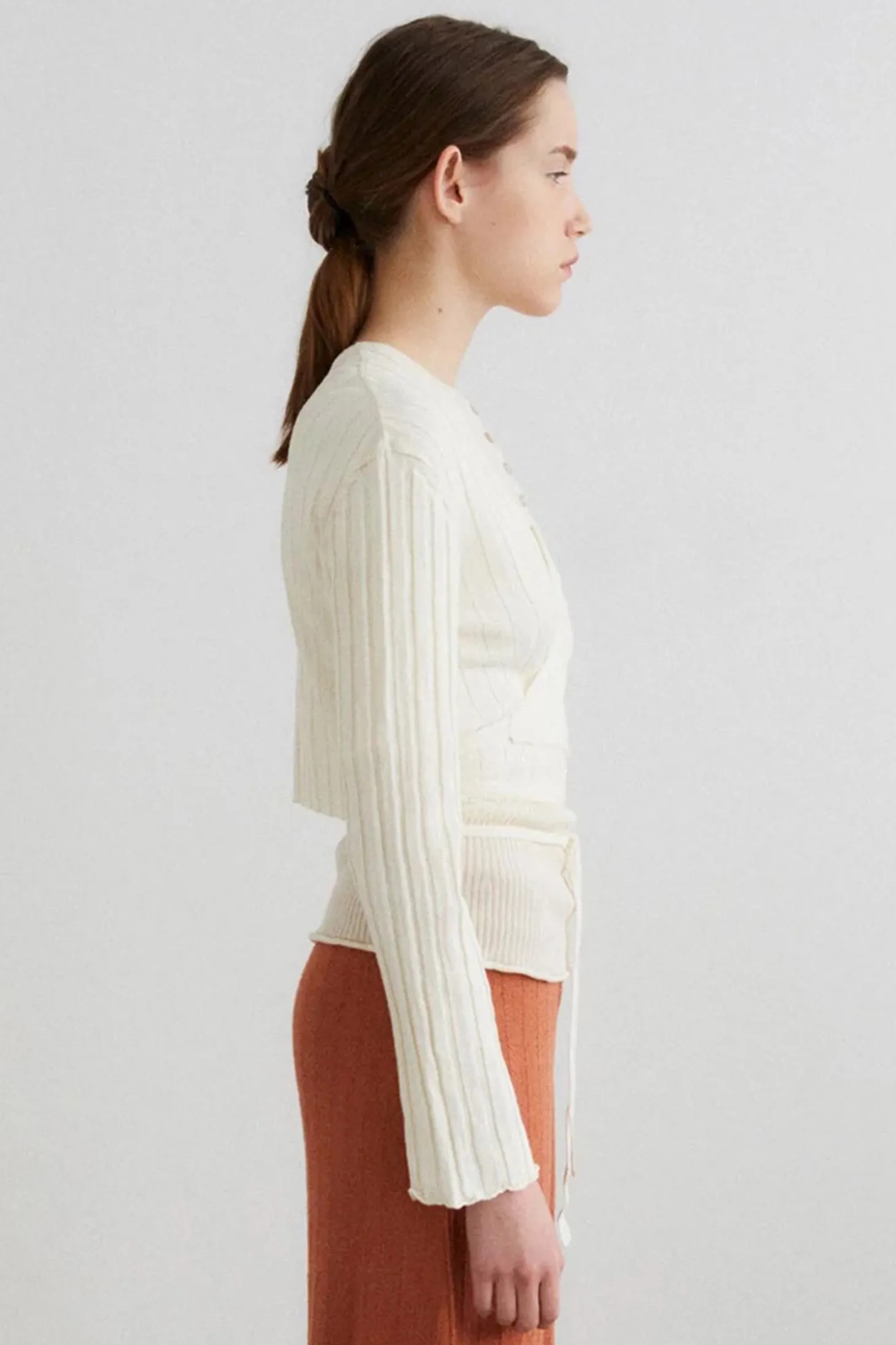 Gerippter Cardigan mit V-Ausschnitt aus einem Leinengemisch mit geschlitzten Manschetten und Gürtel, der auf verschiedene Weise gebunden werden kann.