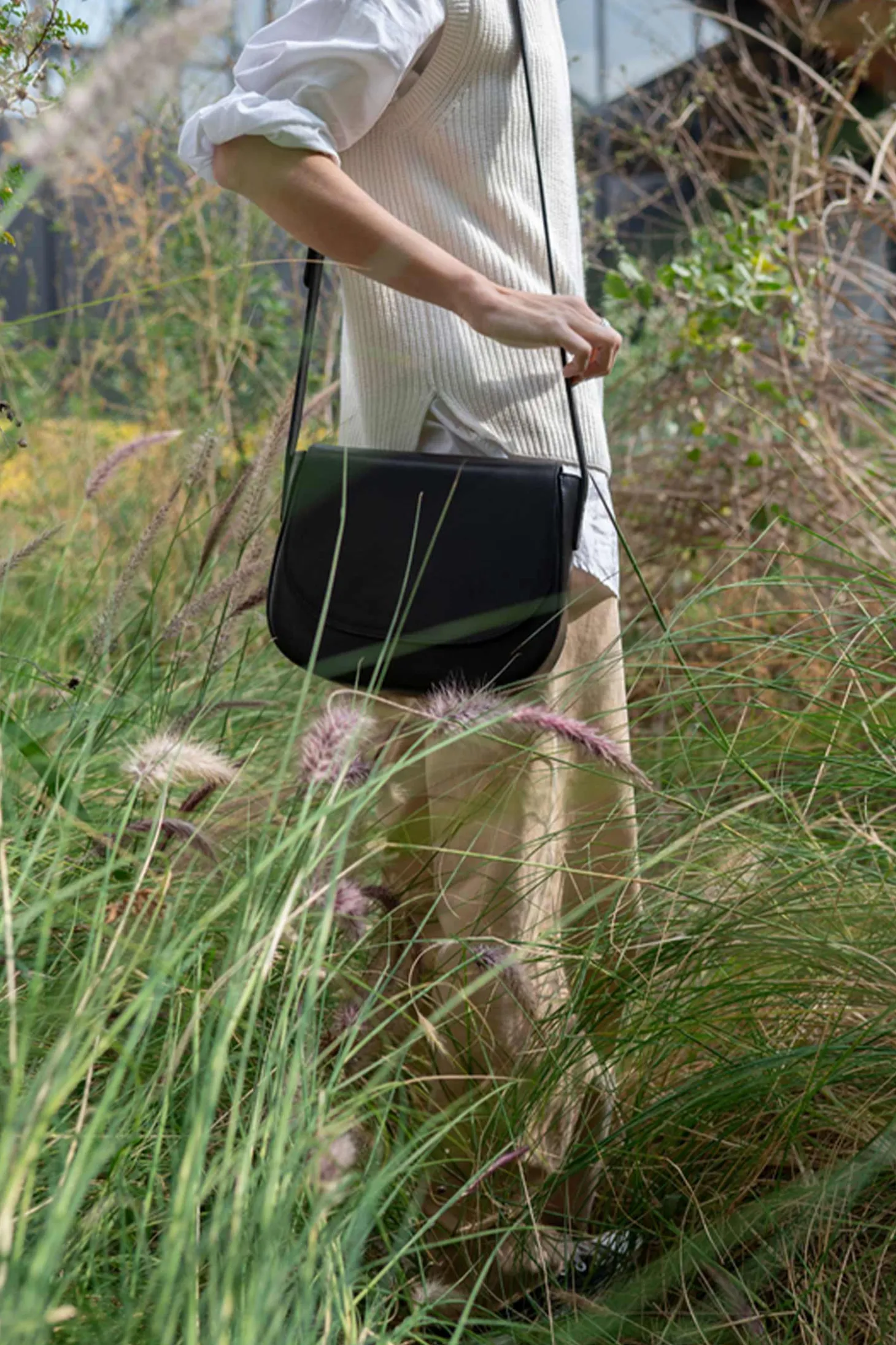 Crossbody-Tasche mit einem geräumigen Fach, einer schmalen Innentasche und einer Aussentasche. Verschluss auf der Vorderseite mit magnetischem Druckknopf. Verstellbarer Querriemen. Beigefarbenes Baumwollfutter.