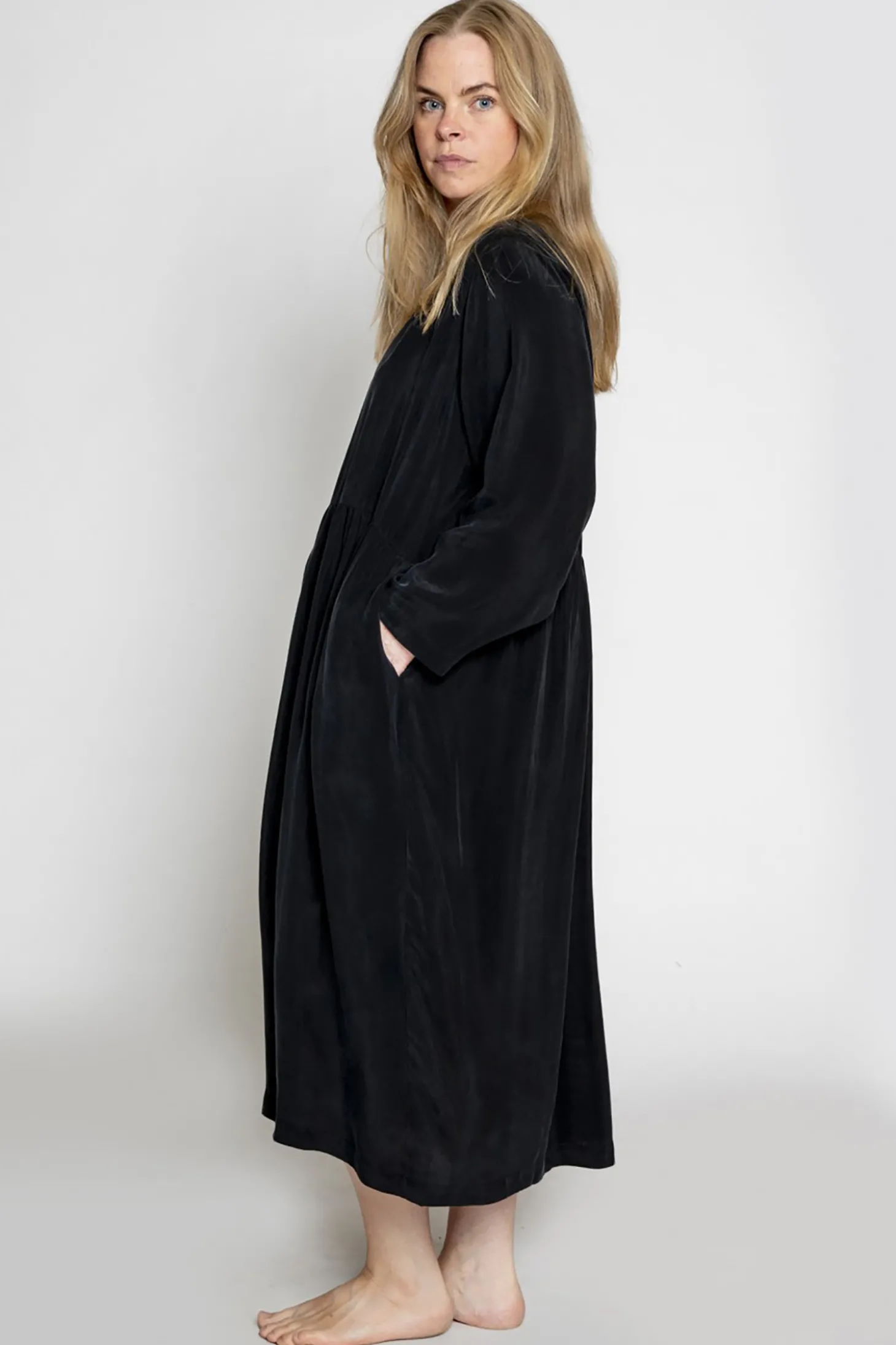 Dieses Kleid ist oversized geschnitten und hat einen Falteneffekt an der Taille. Es hat Knöpfe am Rücken und zwei versteckte Taschen. Alle Model tragen Grösse M oder One Size.