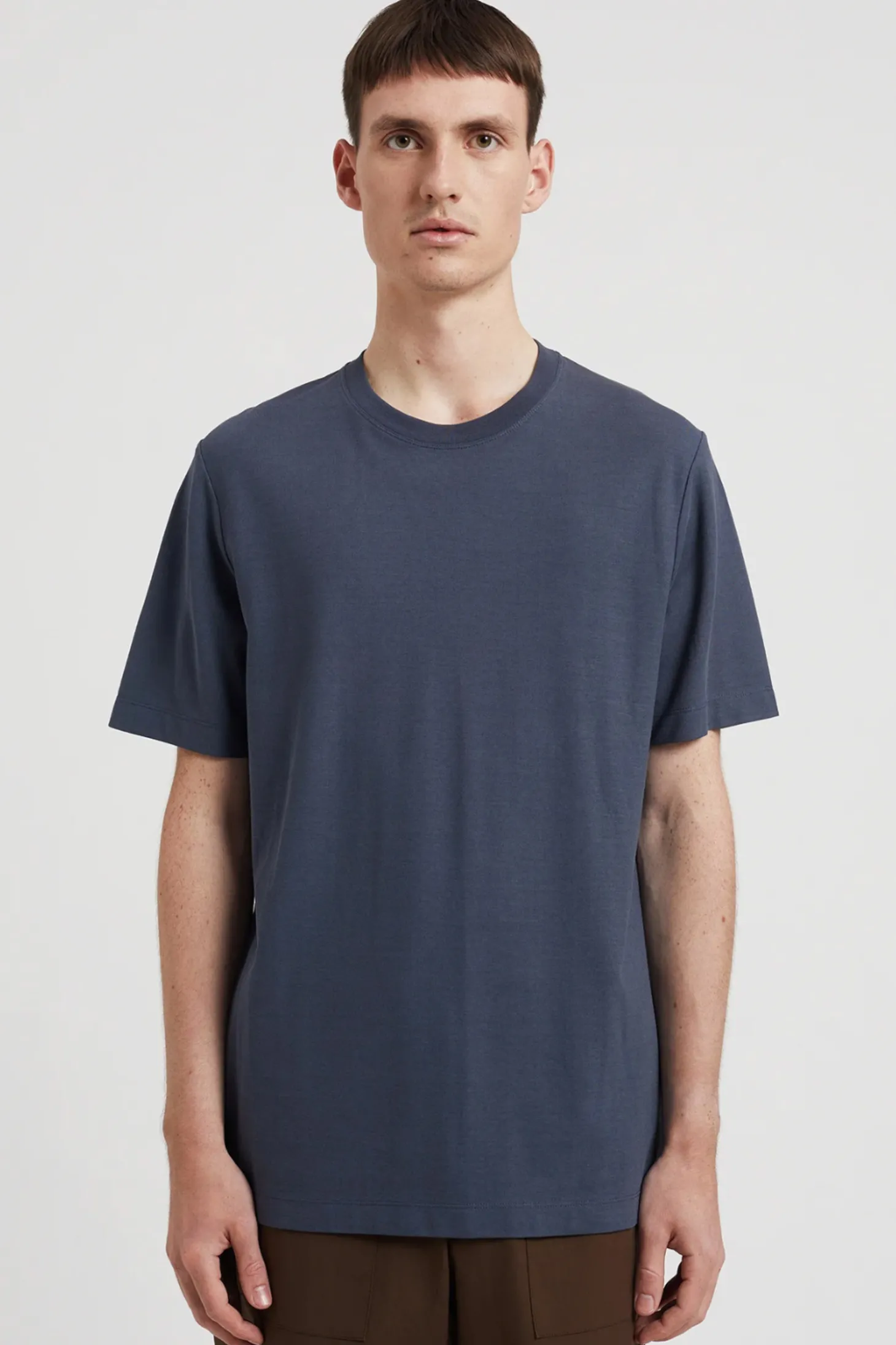 Ein lässig geschnittenes T-Shirt aus mittelschwerem Baumwoll-Crêpe. Es ist mit einem gerippten Kragen und Zwillingsnähten an Saum und Bündchen ausgestattet.