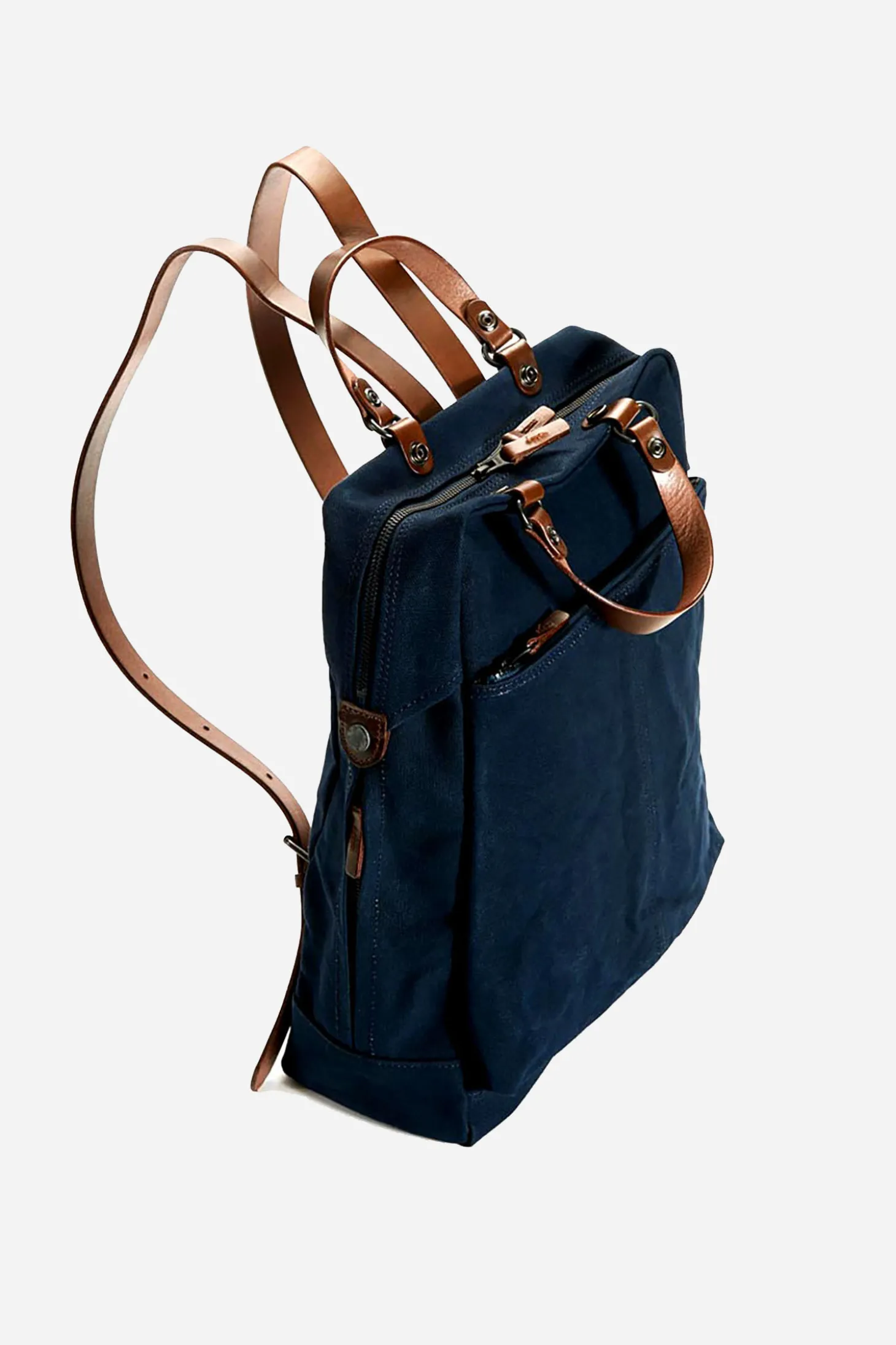 Rucksack-Tasche aus festem wasserabweisendem Segeltuch mit Hand- und Trägeriemen aus Leder und praktischer seitlicher Reissverschlussöffnung. Eher für leichten Inhalt gedacht. Hergestellt in Kobe, Japan.