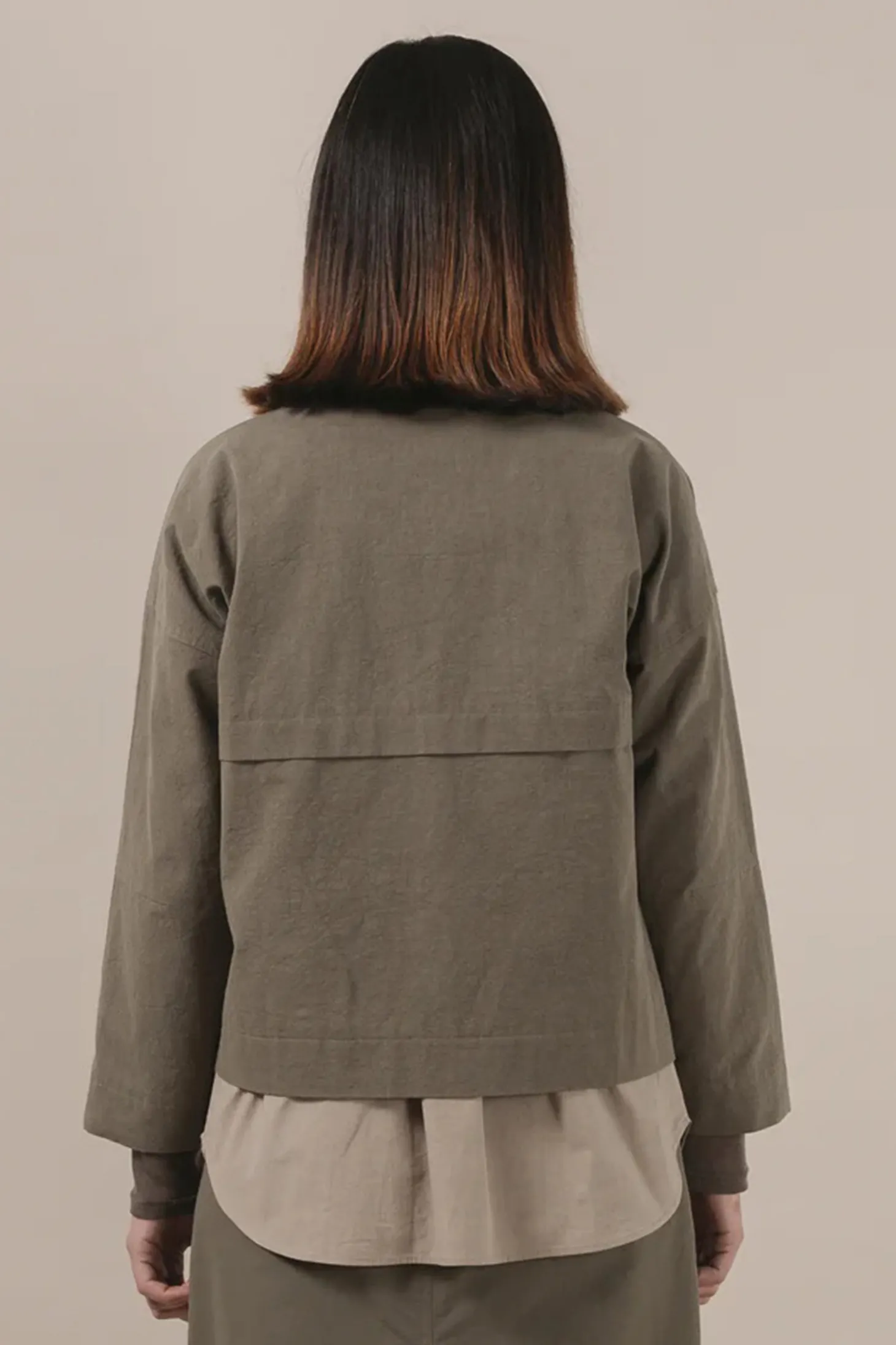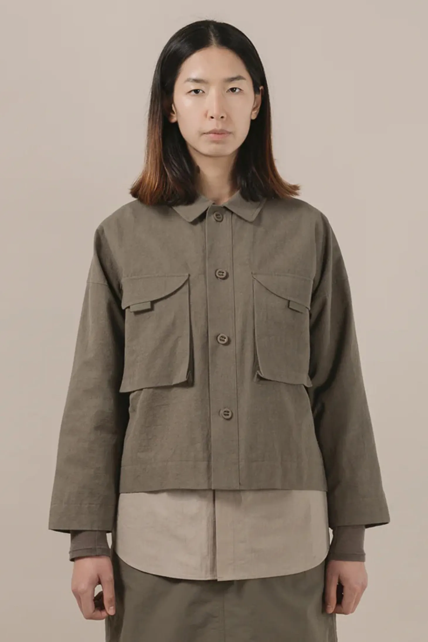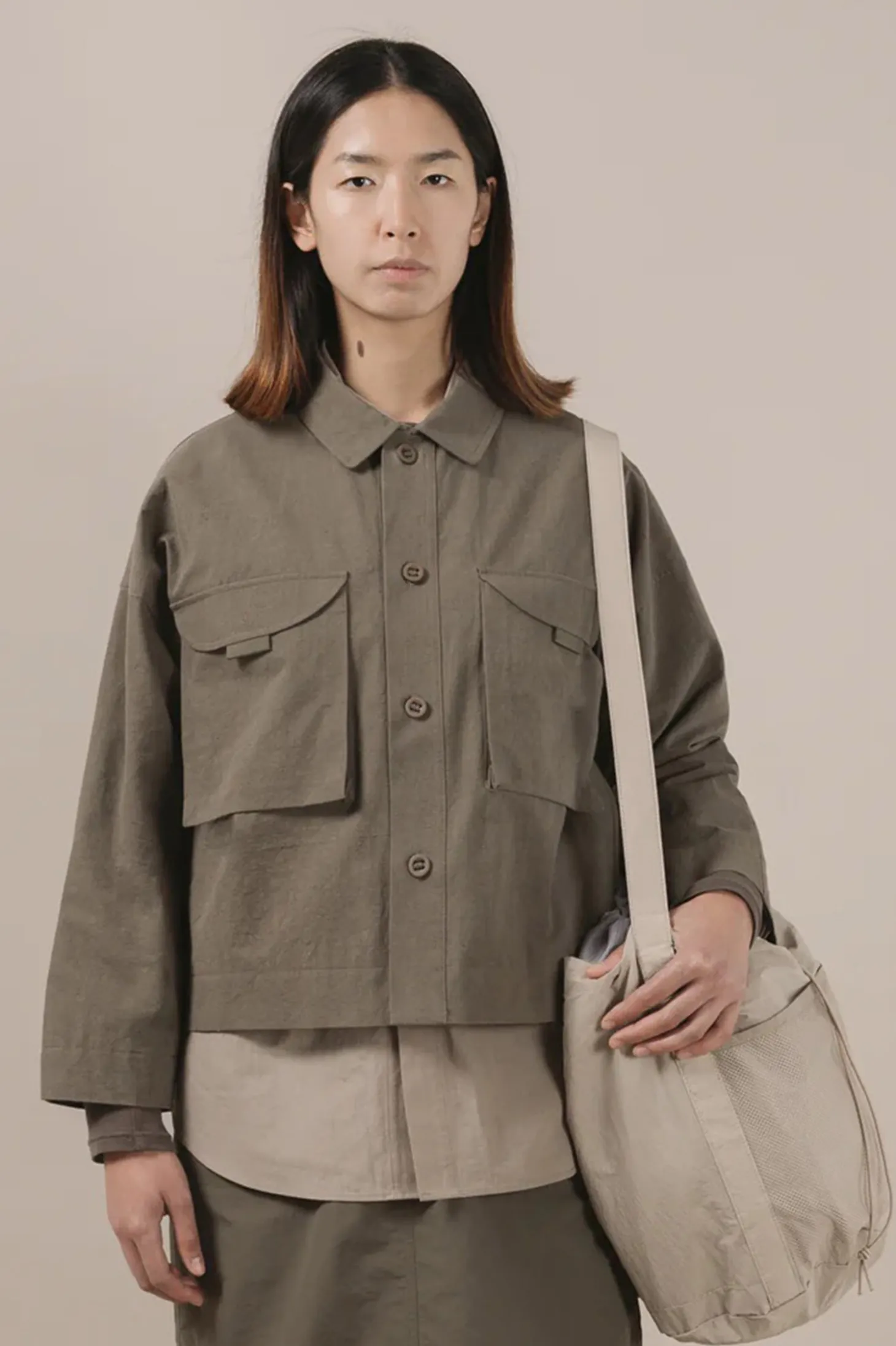 Der kastenförmige Schnitt der Kodo Jacke und die übergrossen Brusttaschen machen sie zusammen mit den charakteristischen Details der Bänder und Schlitzknöpfe zu einem aussergewöhnlichen Stück.