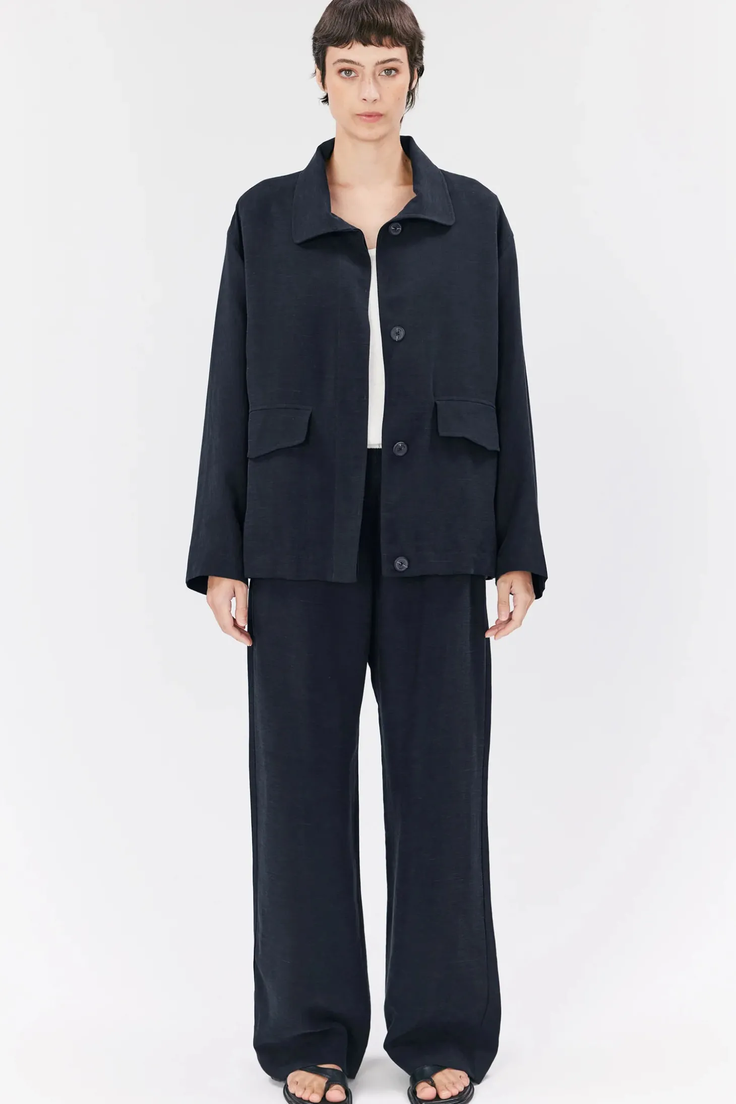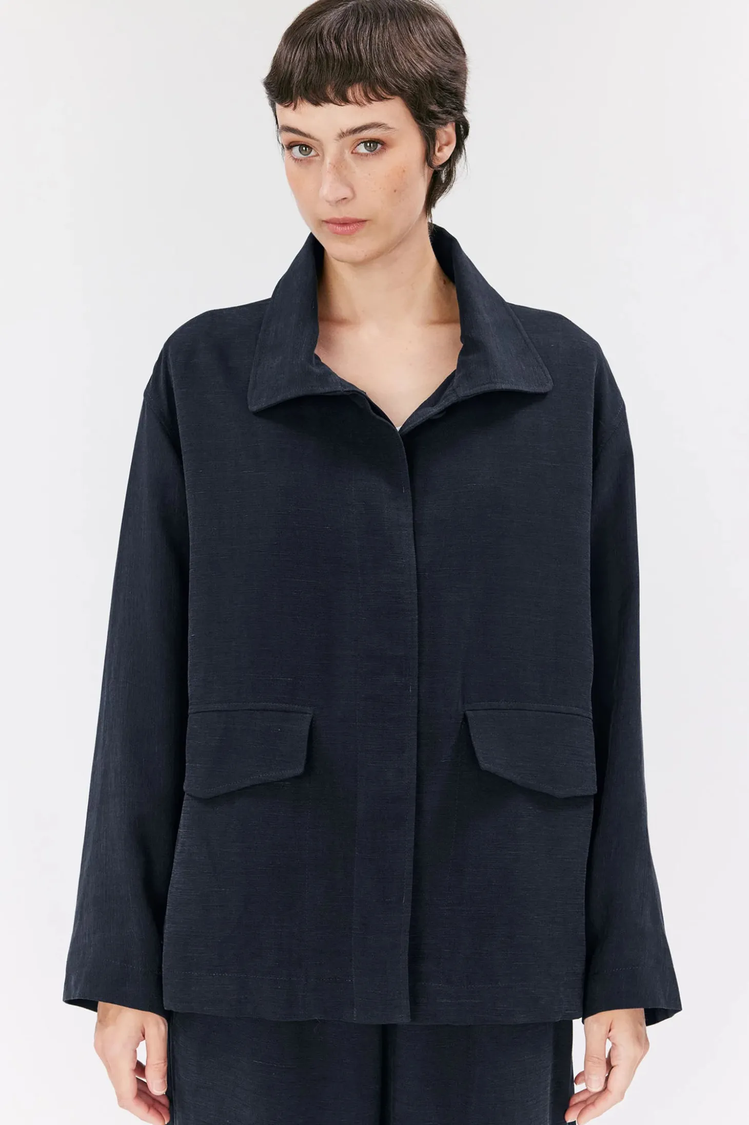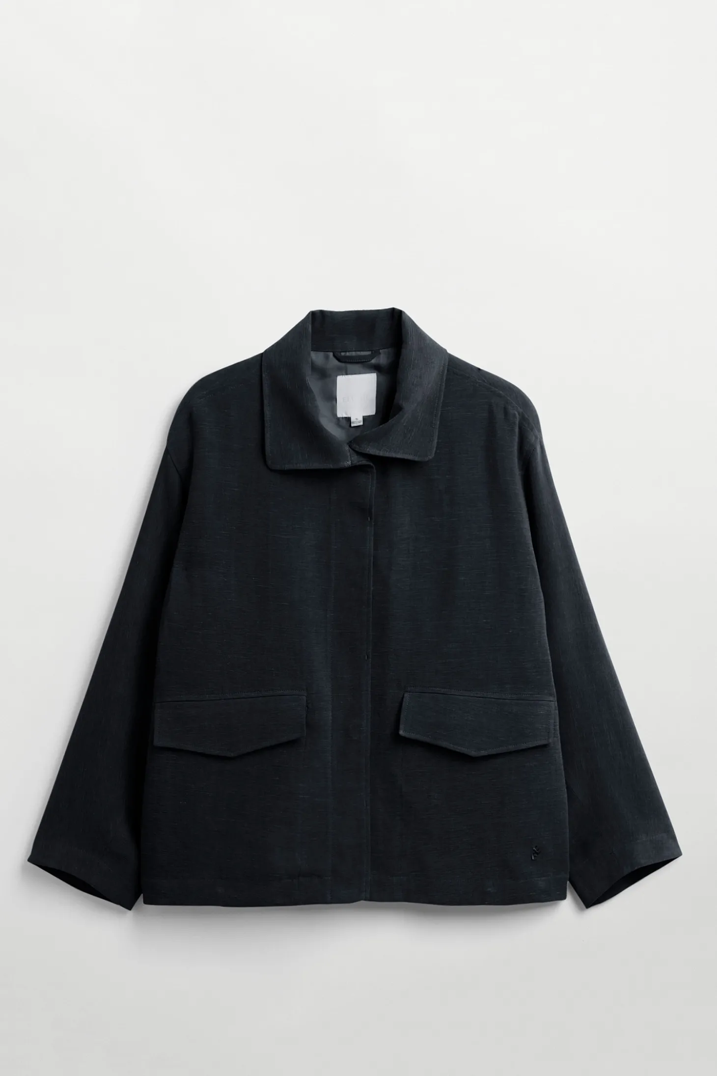 Diese boxy geschnittene Übergangsjacke für Frauen bietet eine perfekte Mischung aus lässigem Stil und moderner Eleganz. Gefertigt aus einer hochwertigen Mischung aus Lyocell und Leinen, kombiniert sie eine angenehme Haptik mit einem entspannten Look. Die Jacke ist vollständig gefüttert und verfügt über eine durchgehende Knopfleiste mit 4-Loch-Knöpfen. Ein elastischer Saum sorgt für eine schmeichelhafte Passform, während die dezente Logo-Stickerei in passender Farbe das Design abrundet.