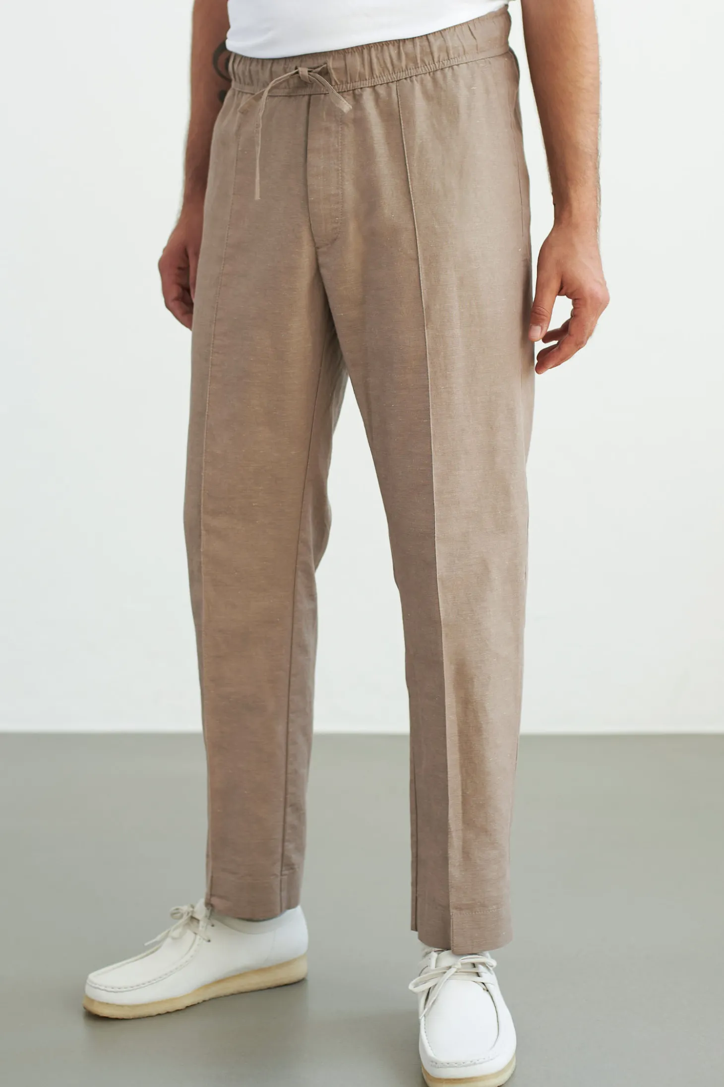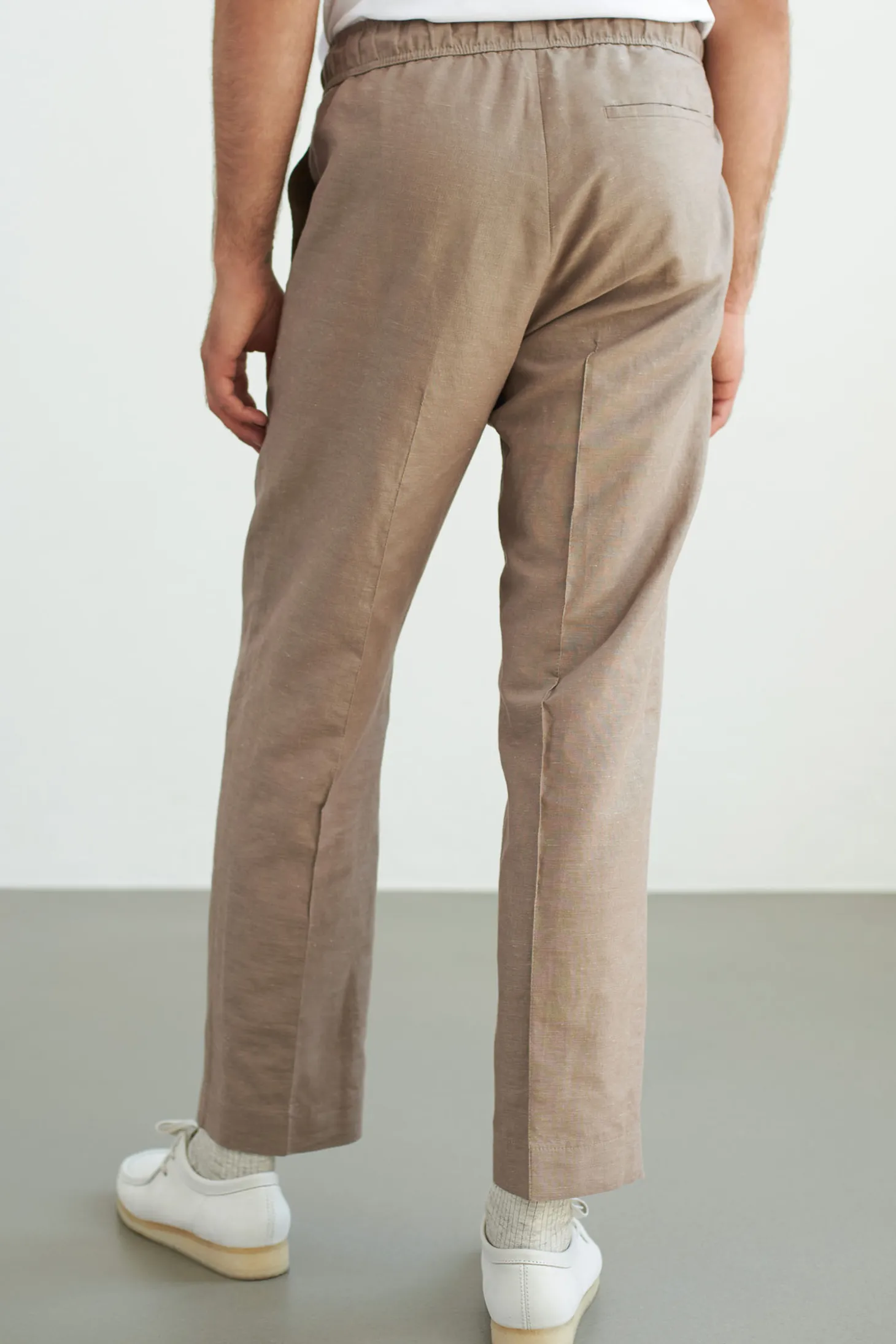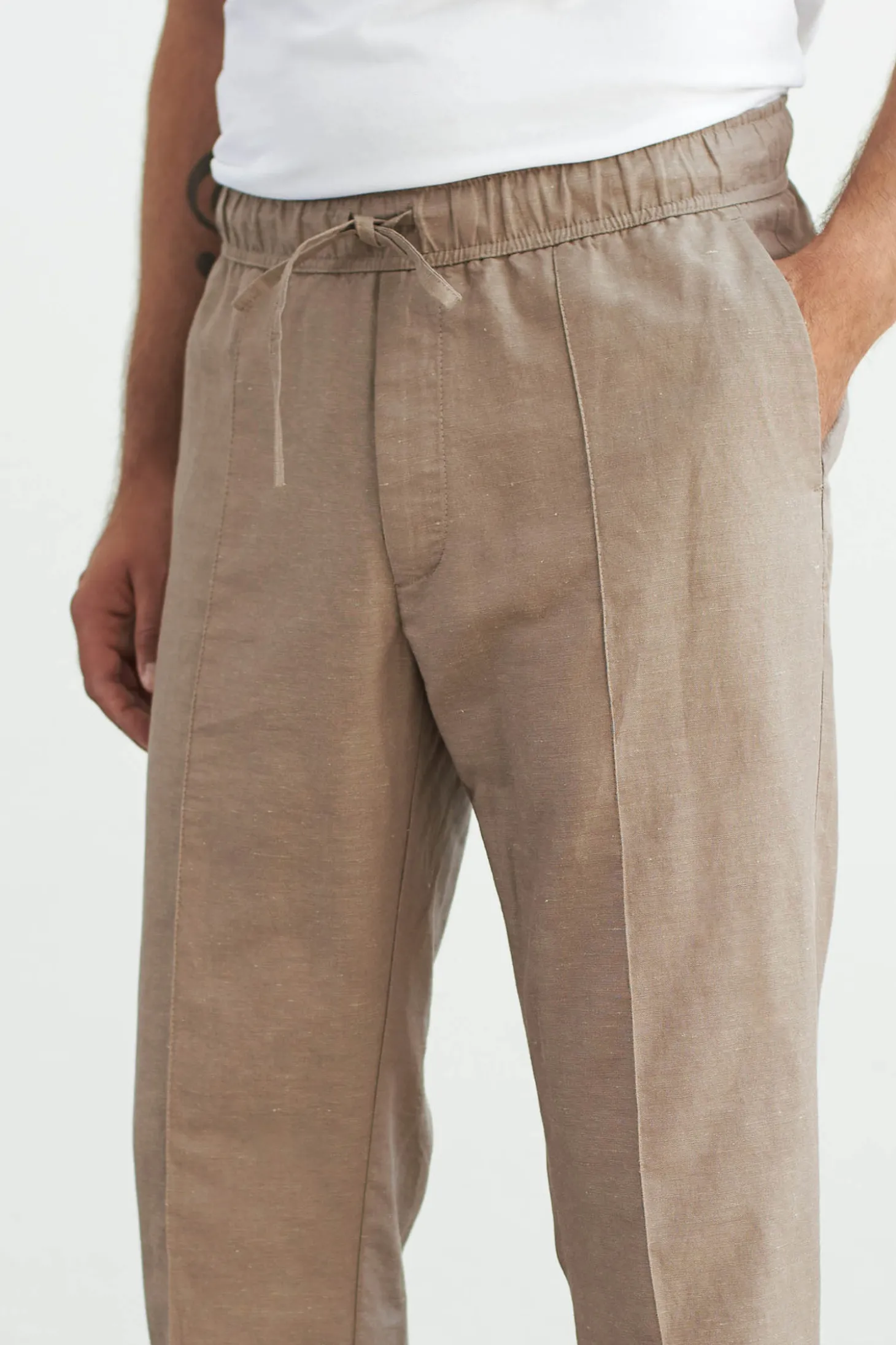 Hose mit Kordelzug aus einer umweltfreundlicher portugiesischer Leinenmischung. Leicht zu tragen als Alltagshose oder als Freizeitanzug. Bequemer, elastischer Bund mit Kordelzug. Sie kommt mit zwei Seitentaschen, einer Gesässtasche mit verstecktem Verschluss um sie in Form zu halten.