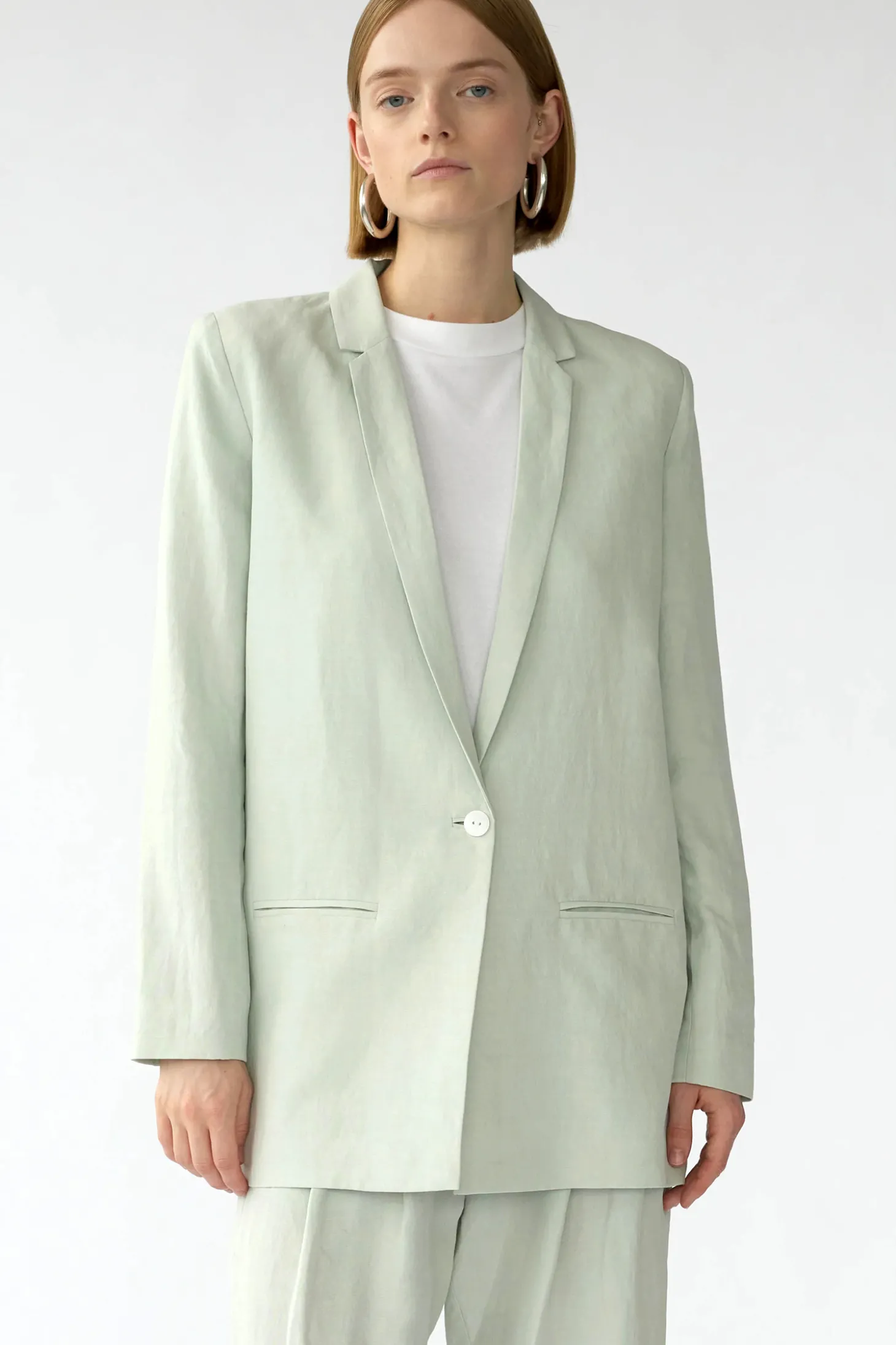 Einreihiger, gerade geschnittener Blazer. Schlankes, langes Revers, zwei Leistentaschen unterhalb der Taille und weisser Muschelknopfverschluss.