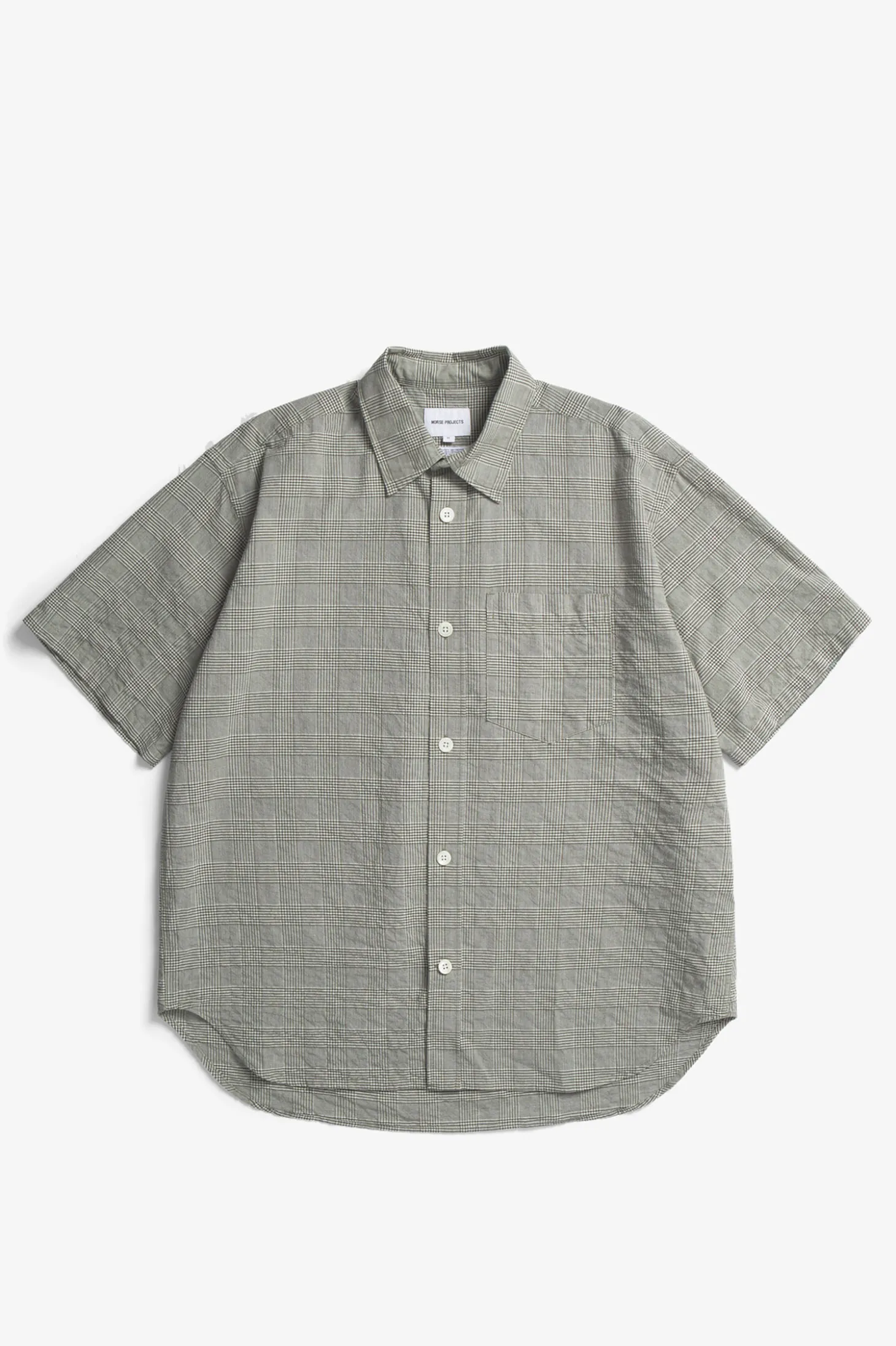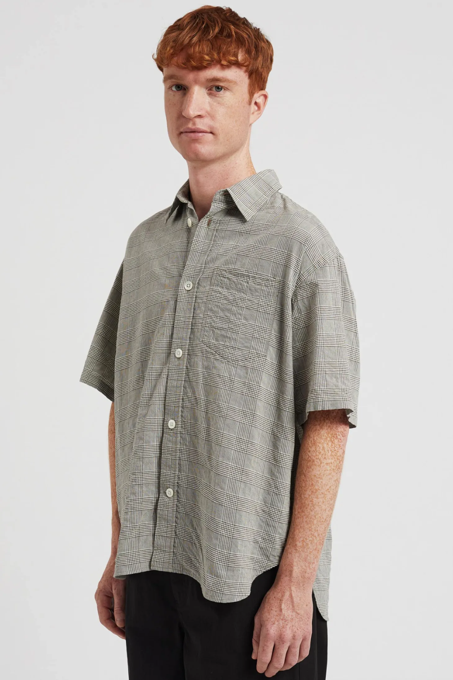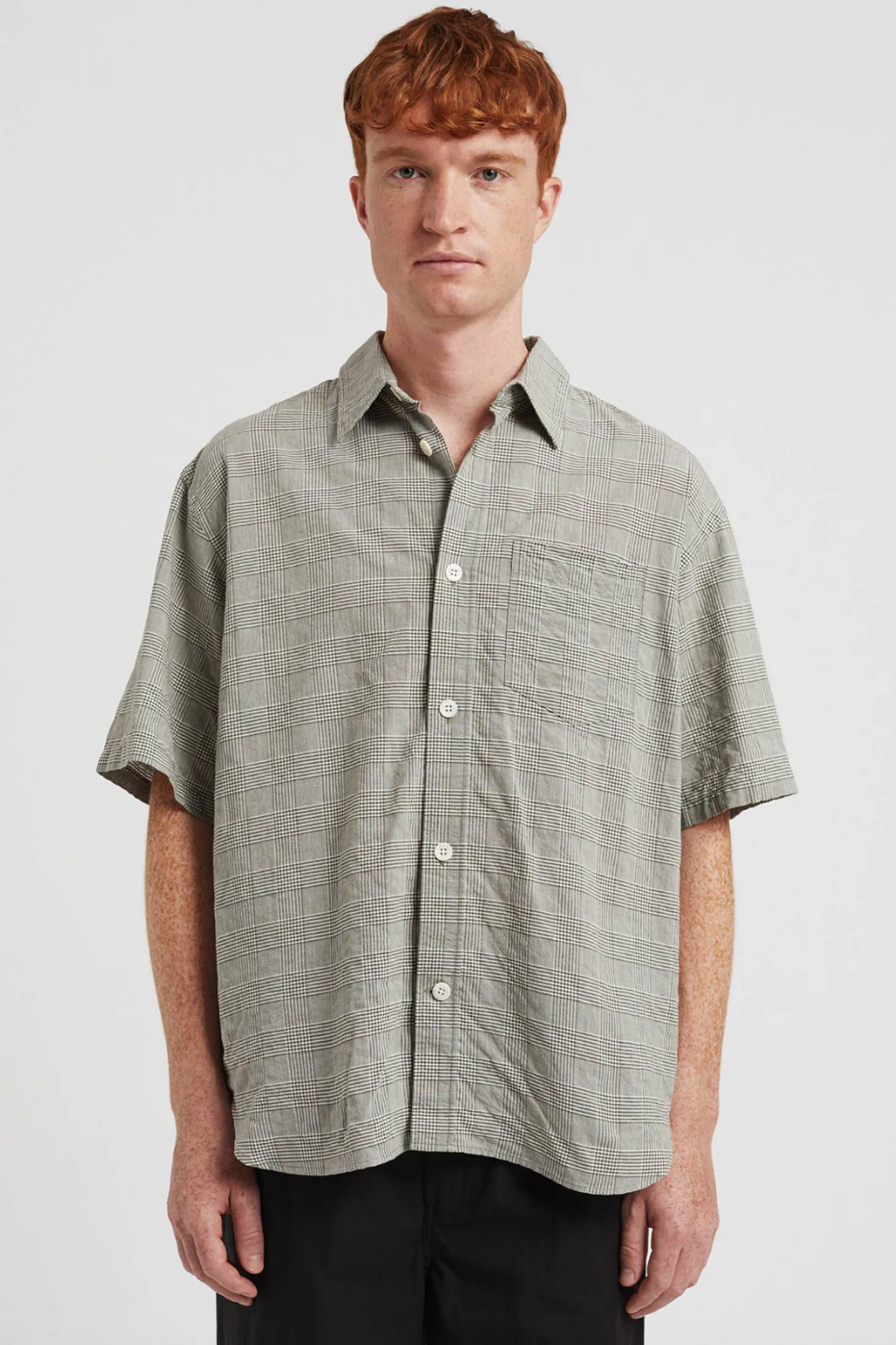 Ein Oversized Kurzarmhemd mit einer leichten Knitteroptik. Es ist mit einer Brusttasche und Perlmuttknöpfen ausgestattet.