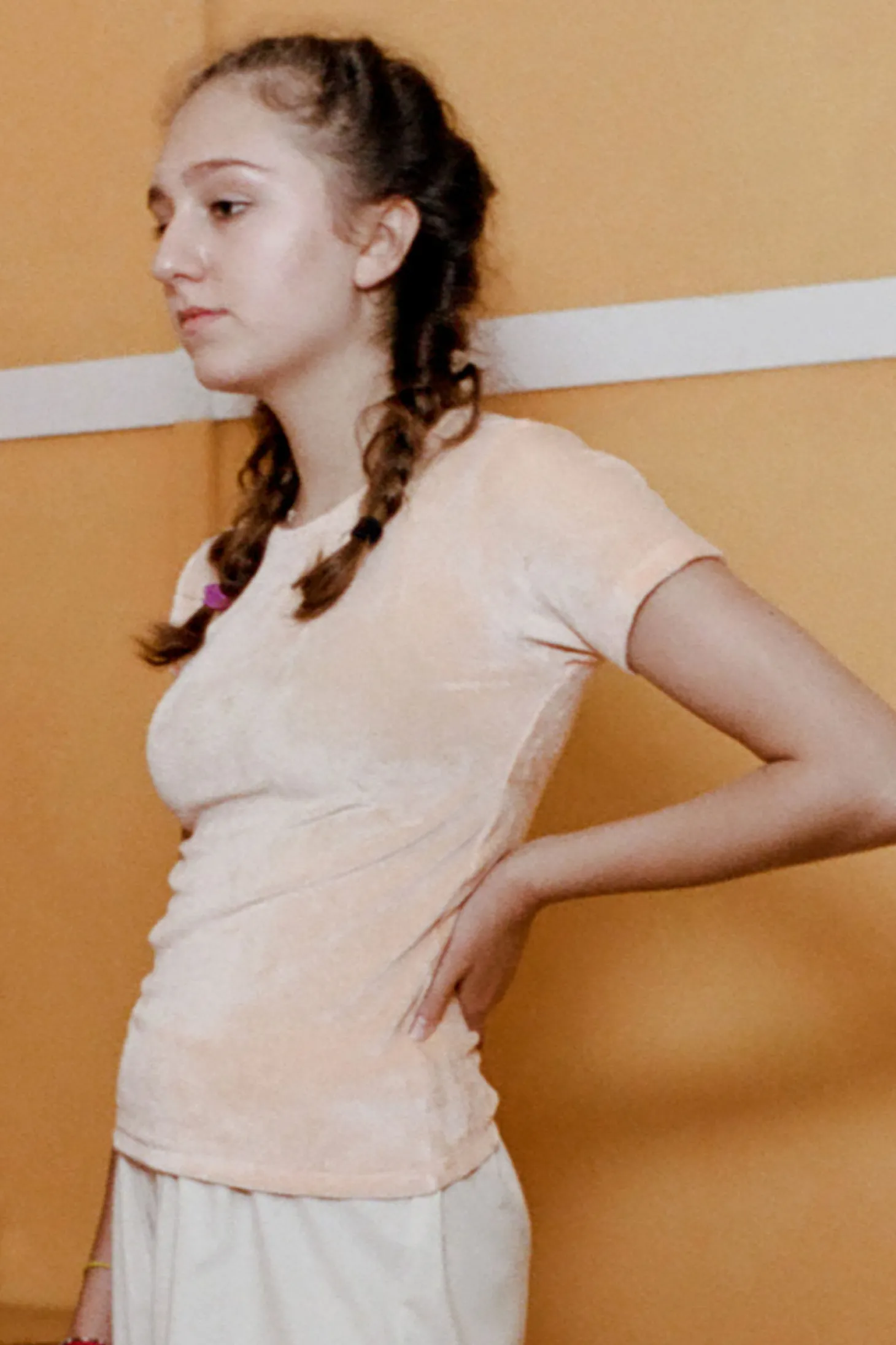 Eng anliegendes T-Shirt aus dehnbarem Velour Material mit hoch geschlossenem Ausschnitt.