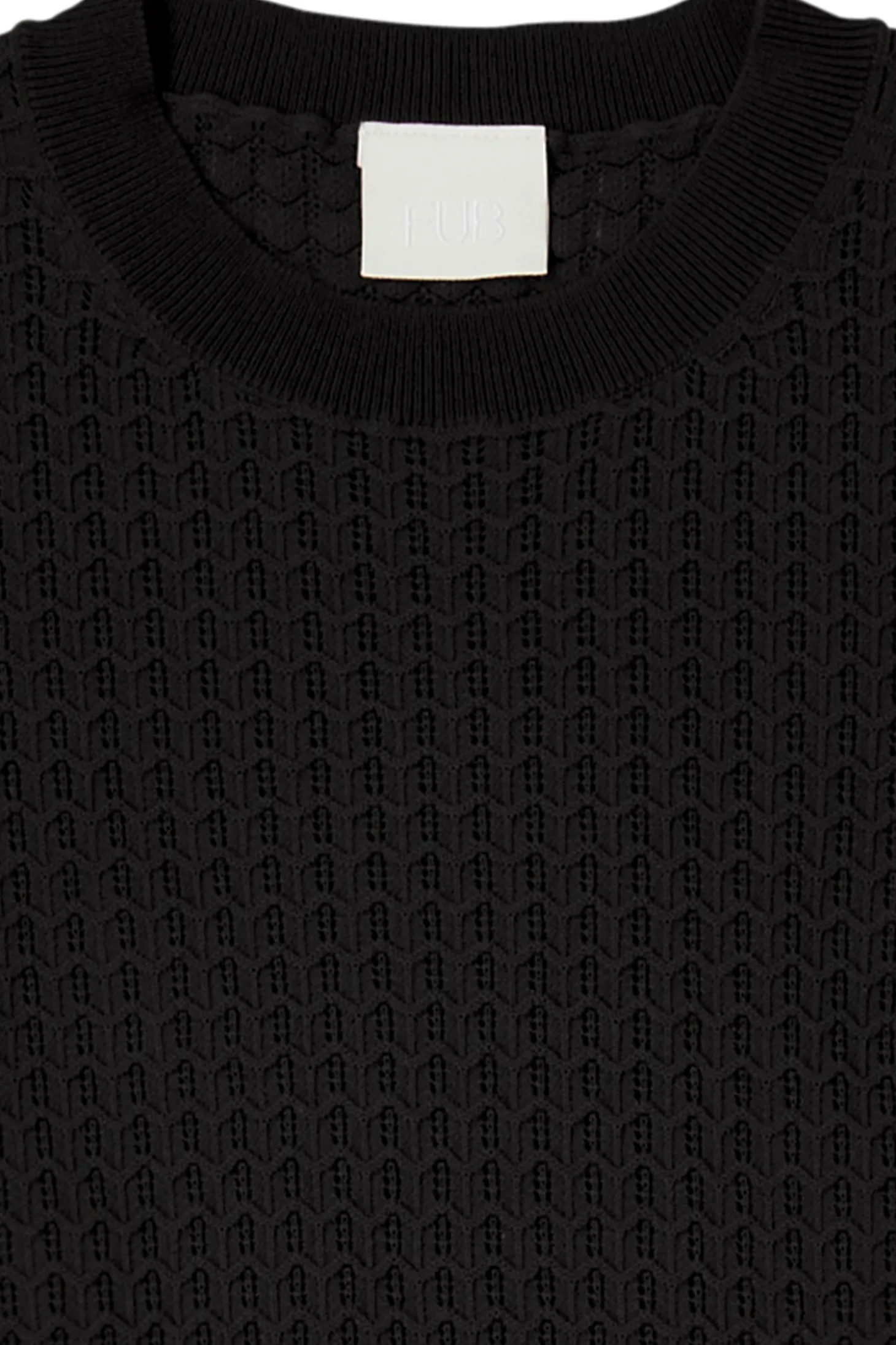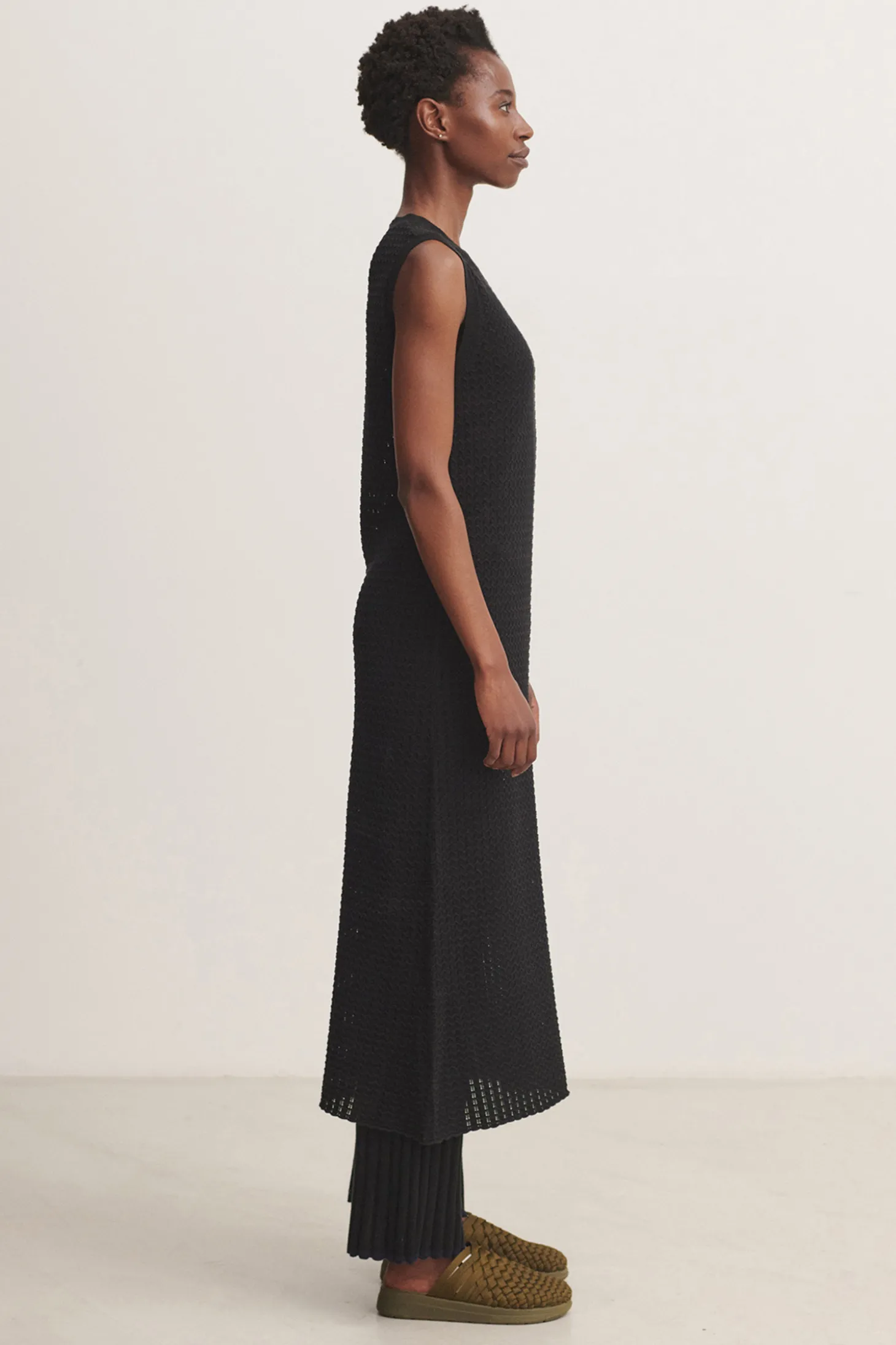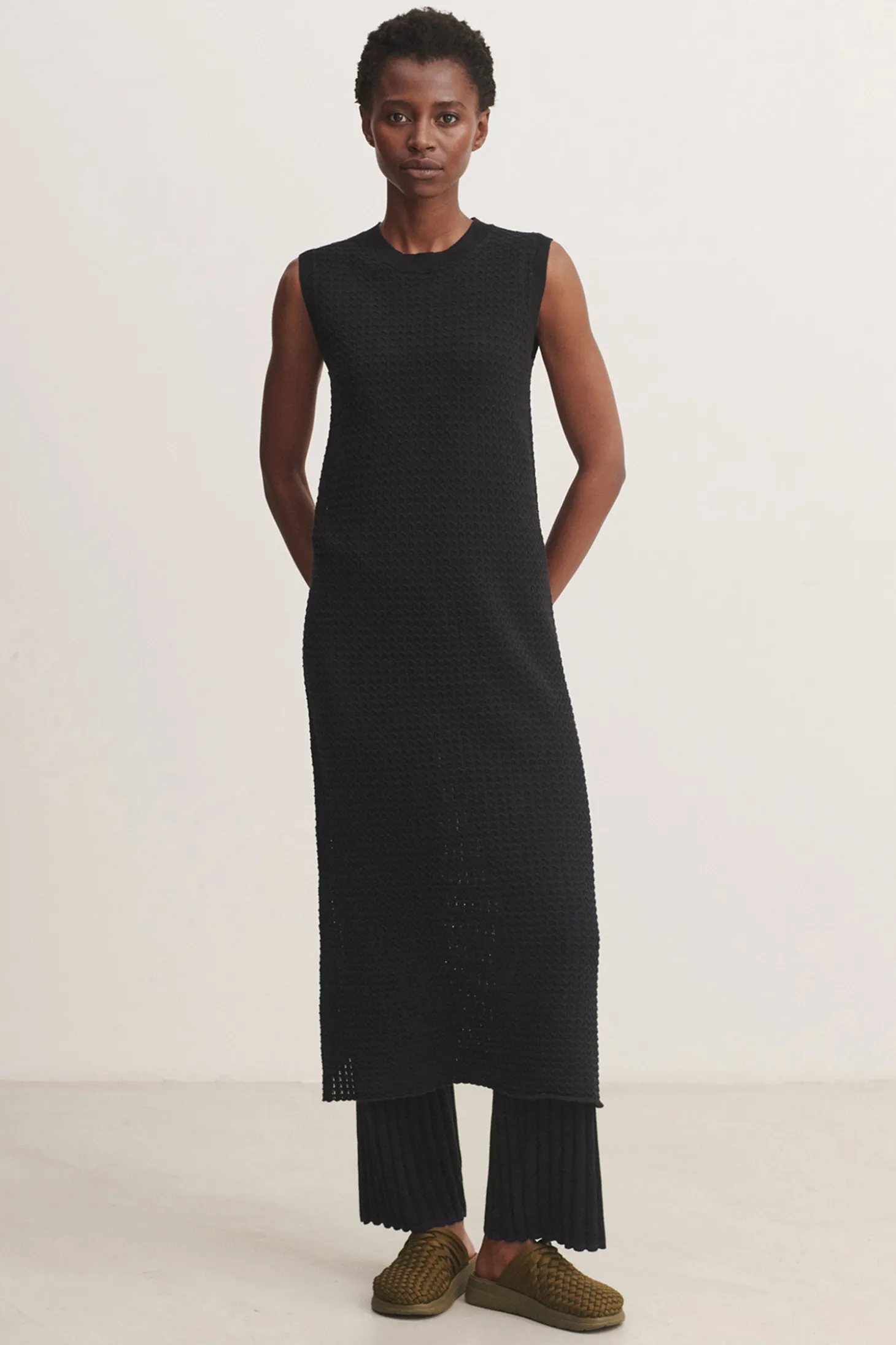 Dieses ärmellose Kleid hat einen klassischen Rundhalsausschnitt und Rippbündchen an Halsausschnitt und Armlöchern. Das Kleid fällt bis zu den Knien und ist mit einem halbtransparenten Pointelle-Muster gestrickt.