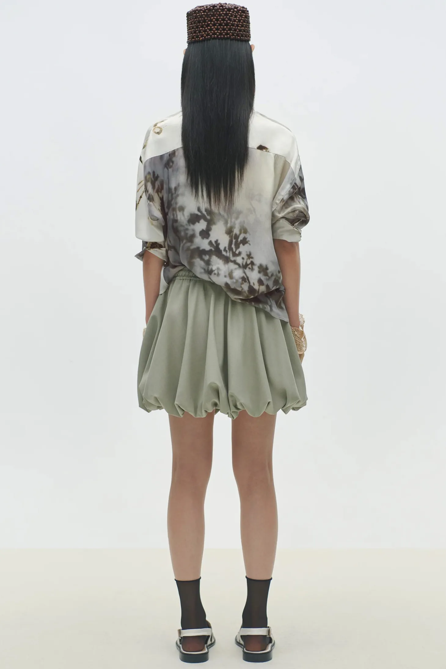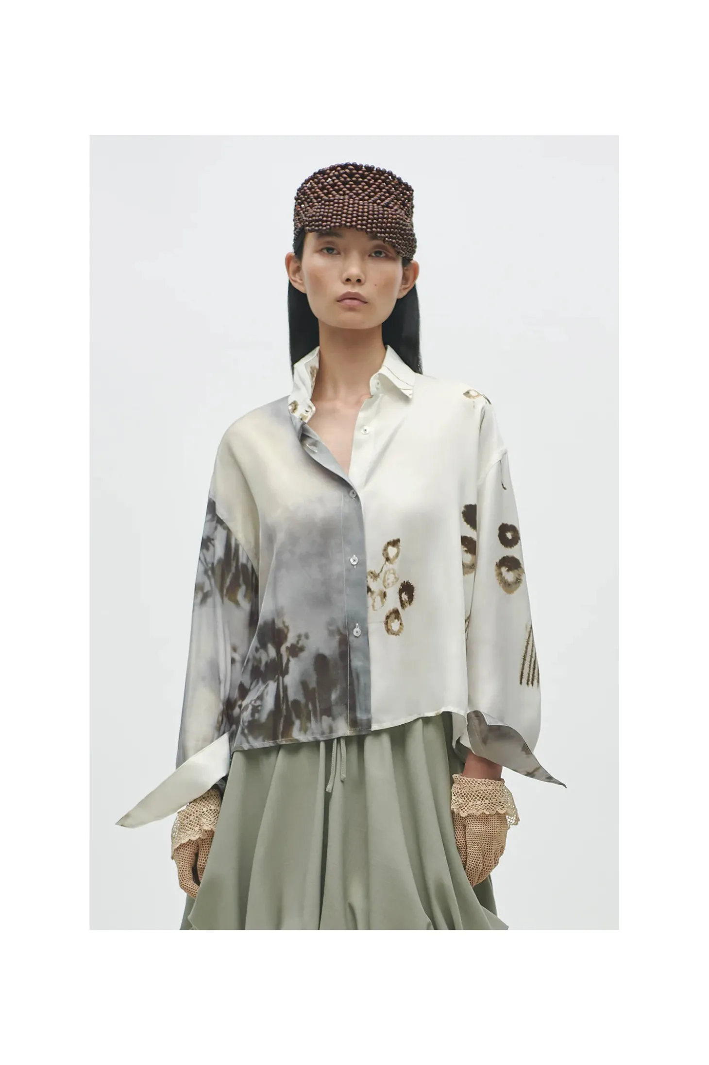 Entworfen in klassischer und leichter Overisze-Passform. Zu den Details gehören lange Ärmel, ein spitzer Kragen und zwei Falten im Rücken, die für Volumen sorgen. Der Stoff ist mit Blättern und abstrakten Motiven bedruckt. Superleicht und fliessend ist es ein perfektes Kleidungsstück für die wärmeren Monate.