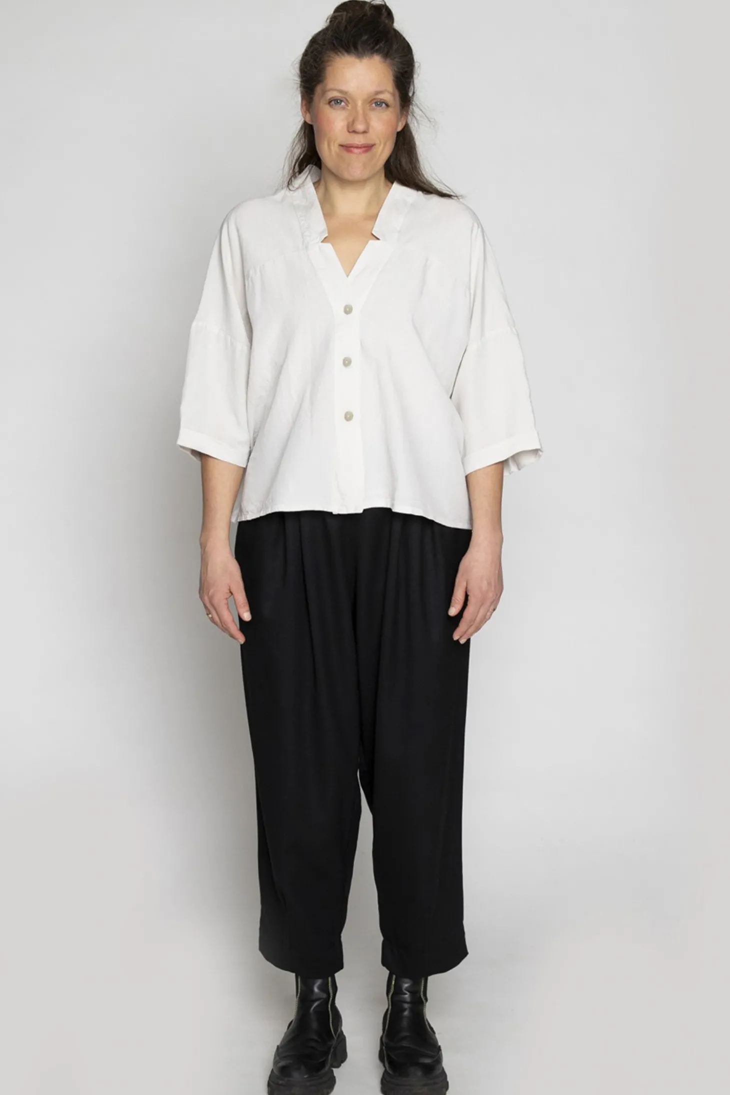 Weite Bluse mit V-Ausschnitt, drei Knöpfen zum Verschliessen und weiten 3/4-Ärmeln. Die Bluse ist vorne mit einer feinen Ziernaht versehen. Alle Modelle tragen Grösse M oder onesize.