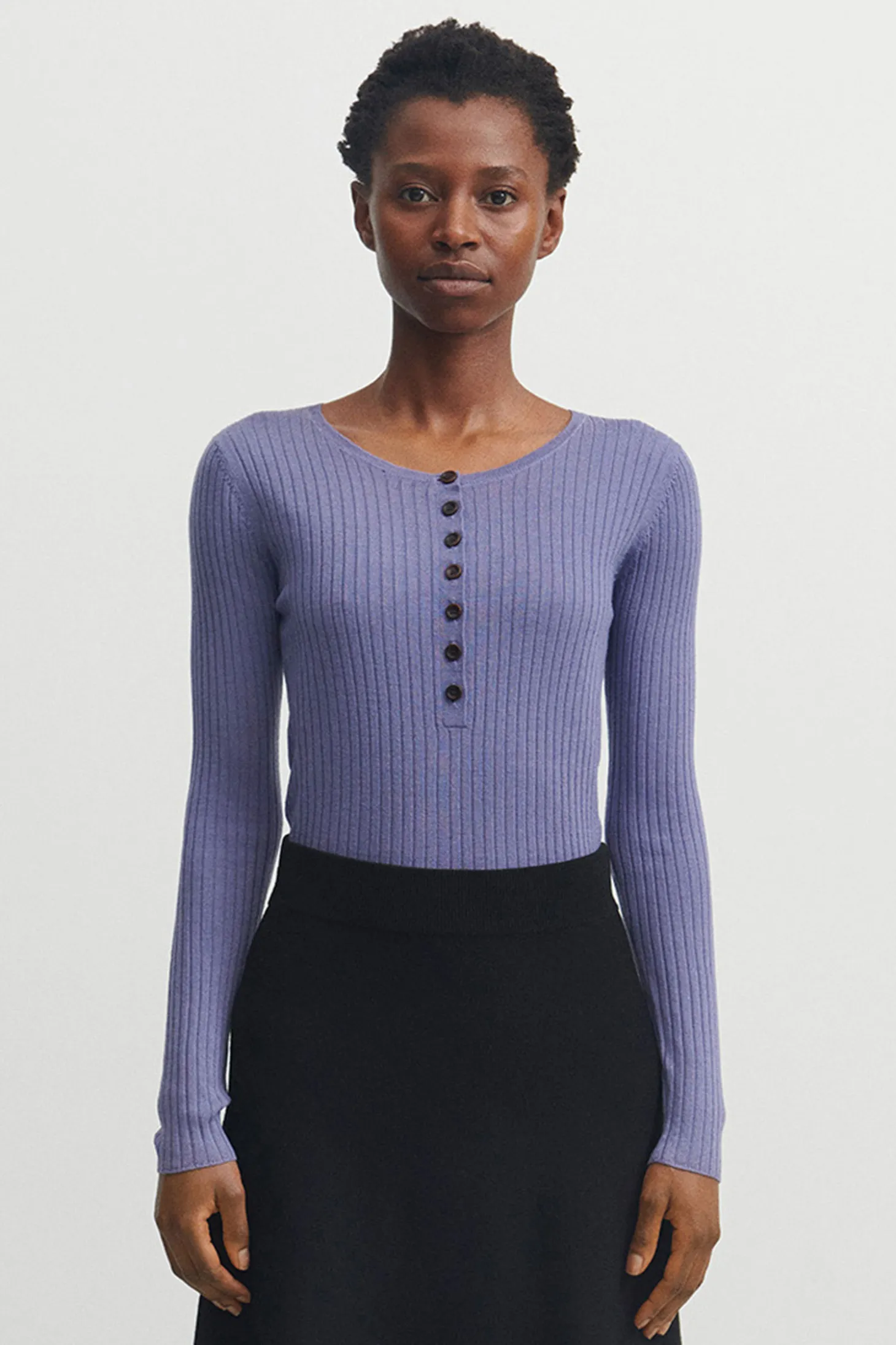 Dieses langarm T-Shirt hat einen Rundhalsausschnitt mit Rippbündchen und wird vorne mit vollständig biologisch abbaubaren Corozo-Knöpfen geschlossen. Die Bluse hat eine schmale Passform und ist in einer klassischen Rippenstruktur gestrickt.