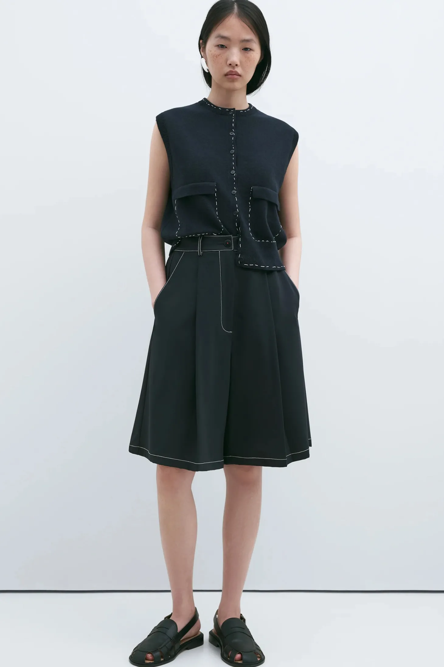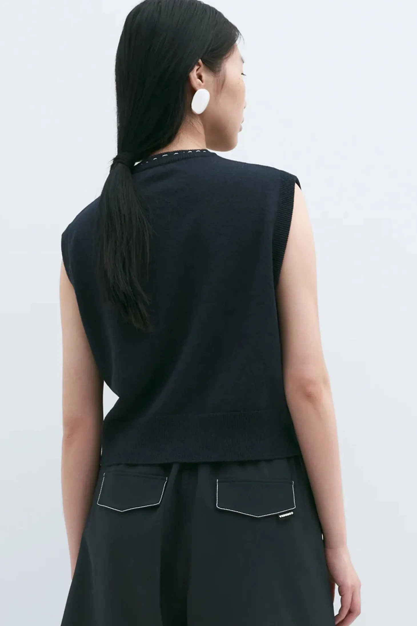Diese Weste ist aus Merinowolle gefertigt und hat eine normale Passform. Mit kleinen Knöpfen vorne als Verschluss, zwei falschen Taschen und Rundhalsausschnitt. Detailliert mit unregelmässigen und sehr subtilen handgemachten Nähten und einem gerippten Abschluss am unteren Rand.