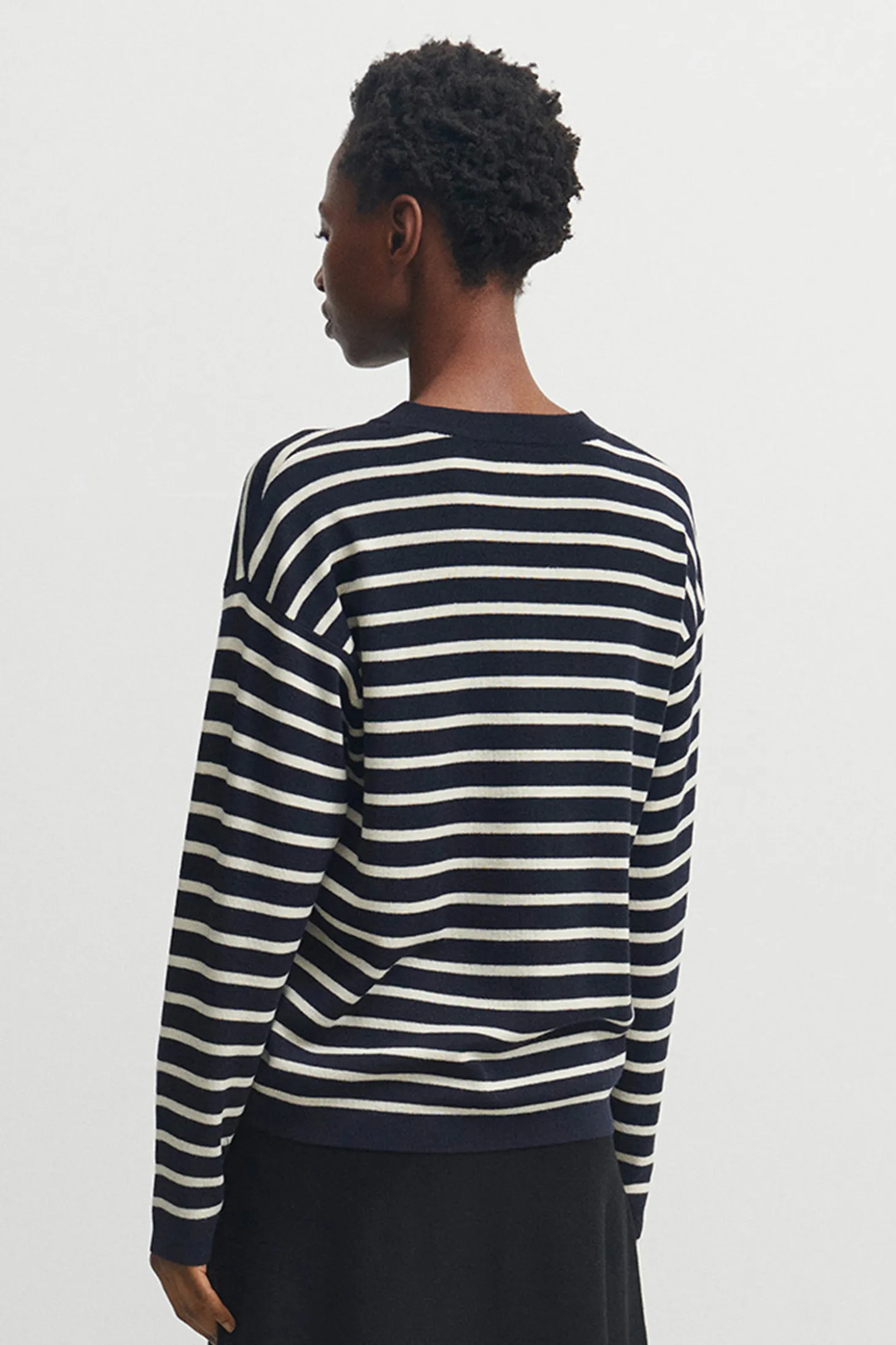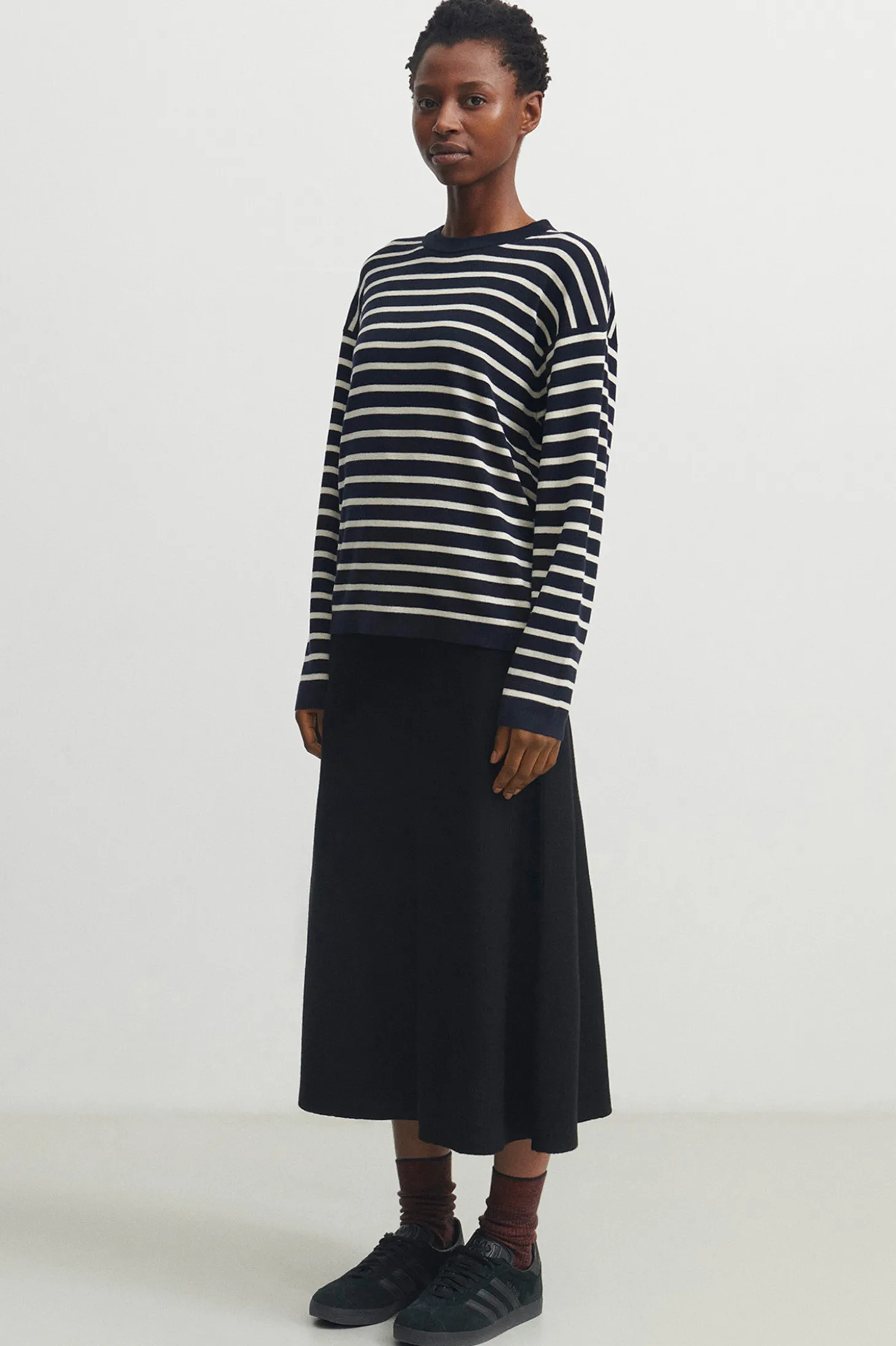 Dieser locker geschnittene Pullover ist aus extrafeiner Merinowolle in 1×1 gestreiften Rippenstruktur gestrickt. Die Wolle ist frei von schädlichen Chemikalien.