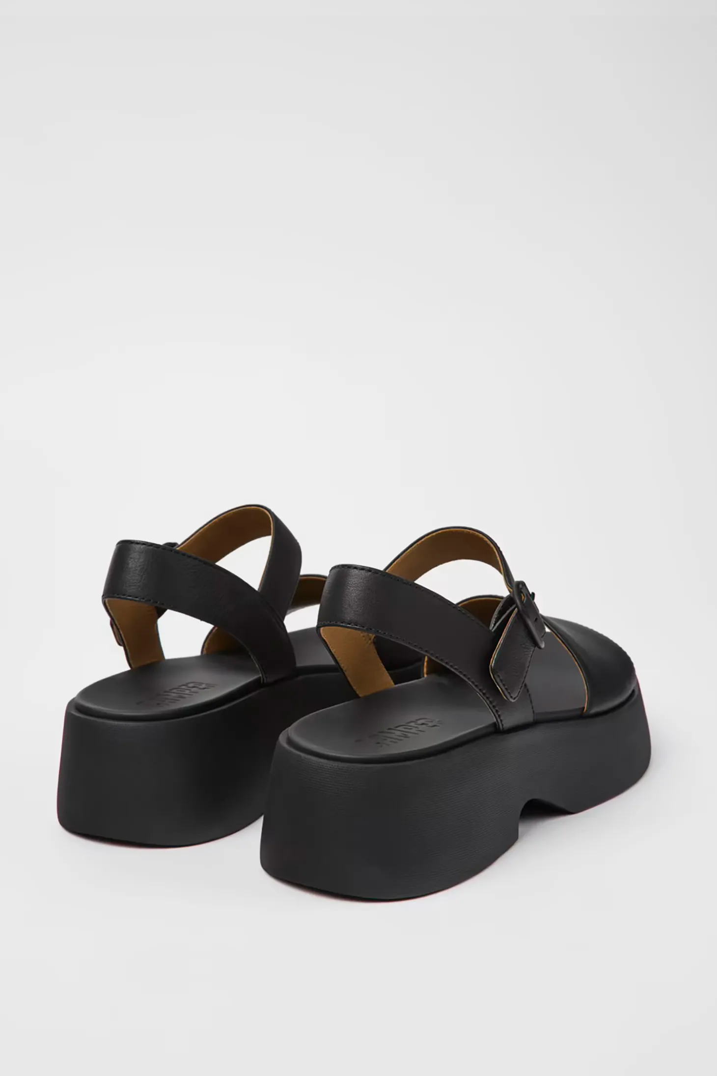 Plateau Ledersandalen mit einem Schnallenverschluss am Knöchel. Die Plateau Höhe misst ca. 4 cm.