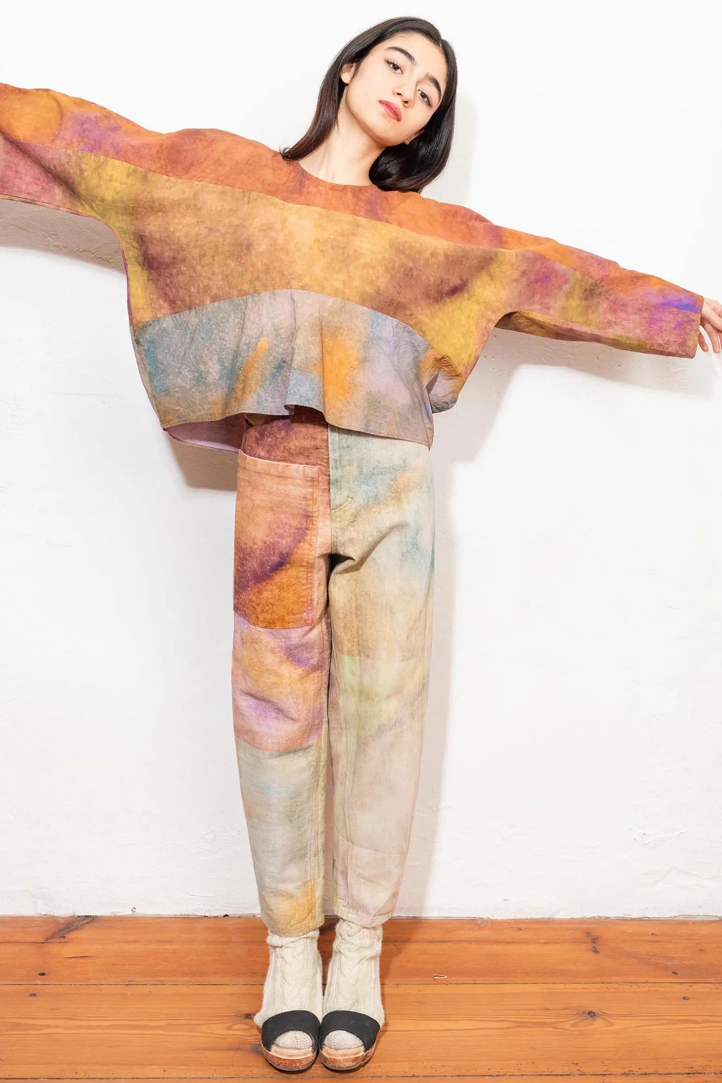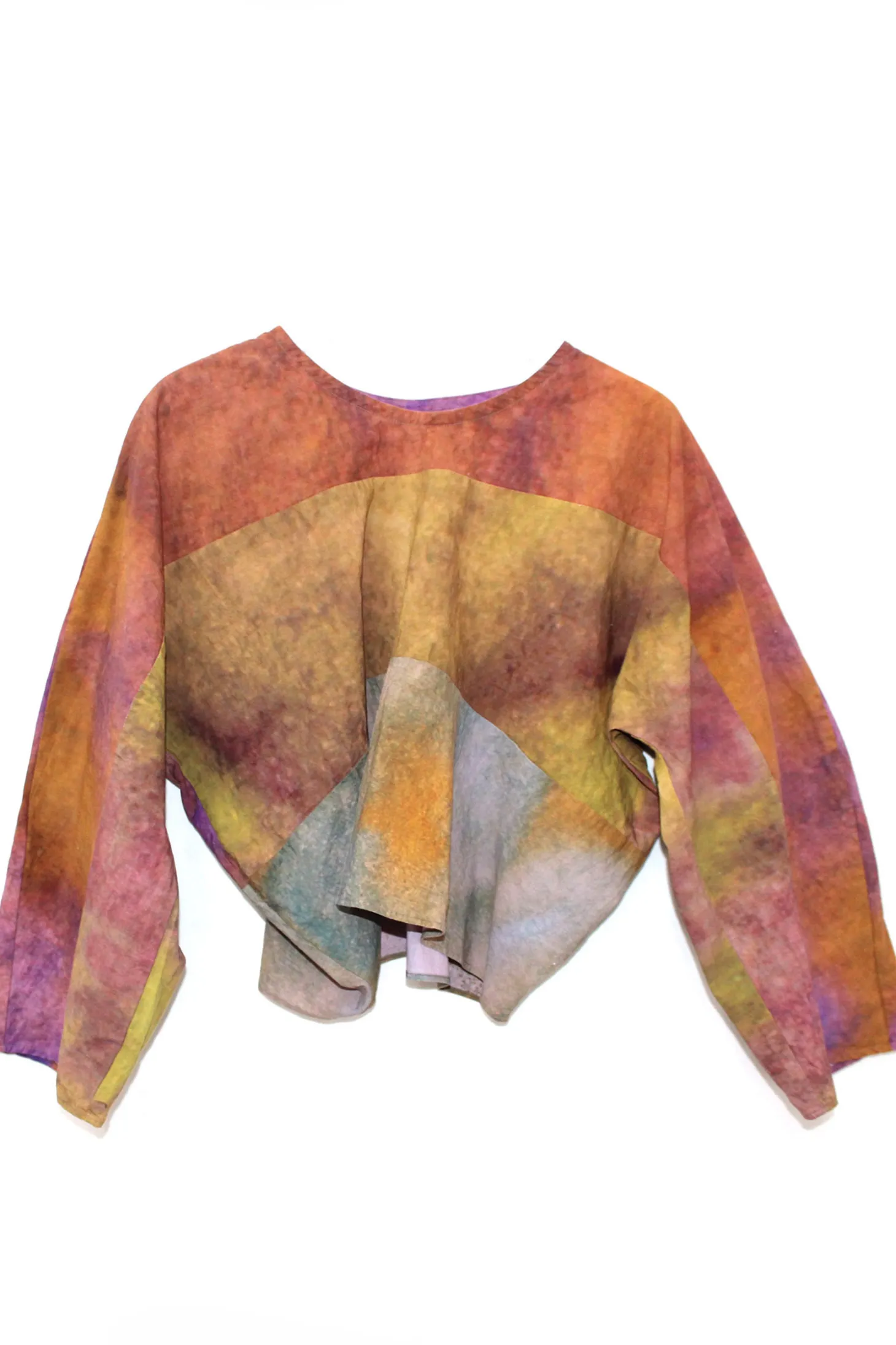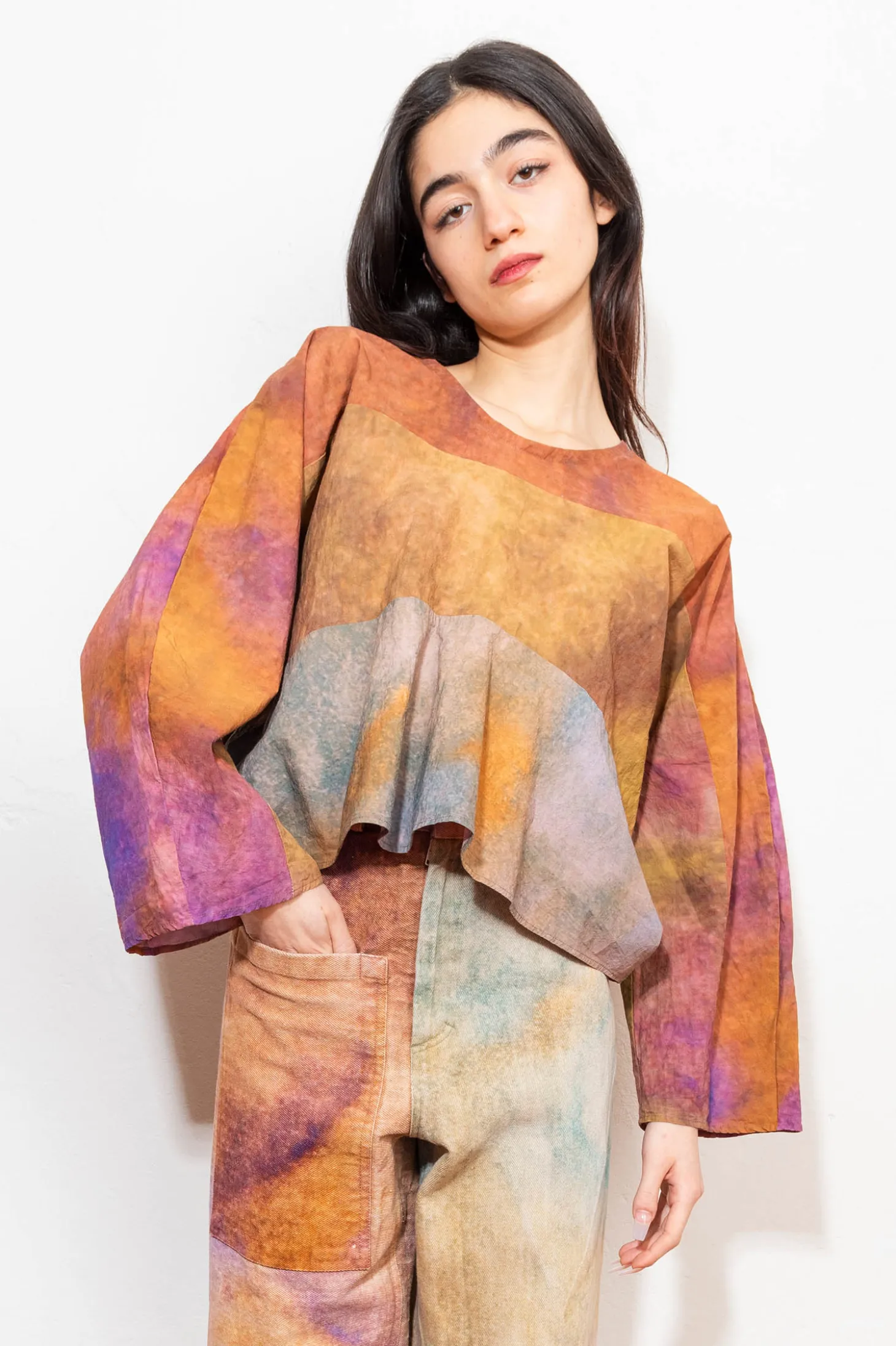 Bluse aus fester Baumwolle in einer leicht runden, verkürzter Form. Sie hat einen Rundhalsausschnitt und überlaufende Fledermausärmel.