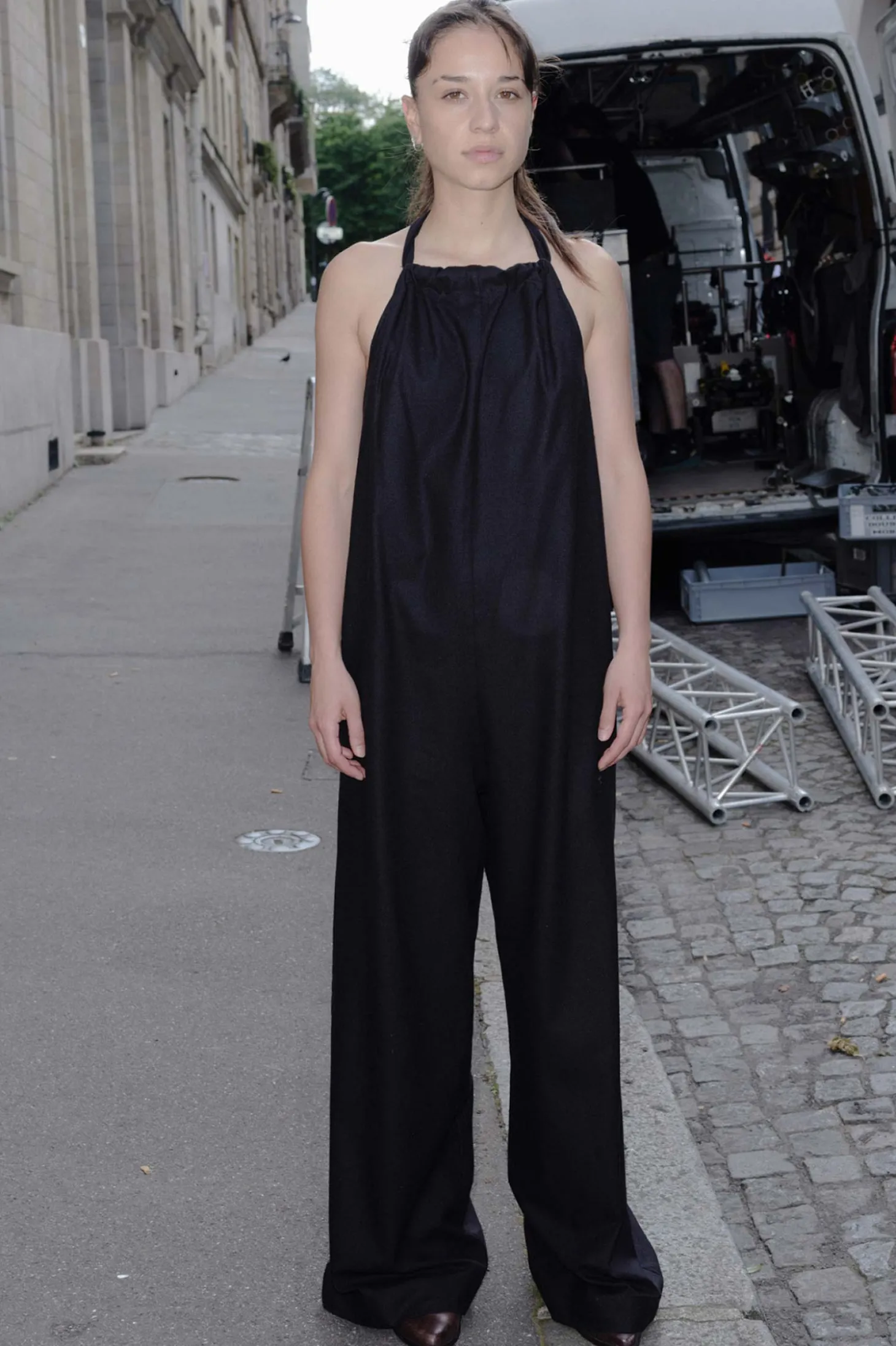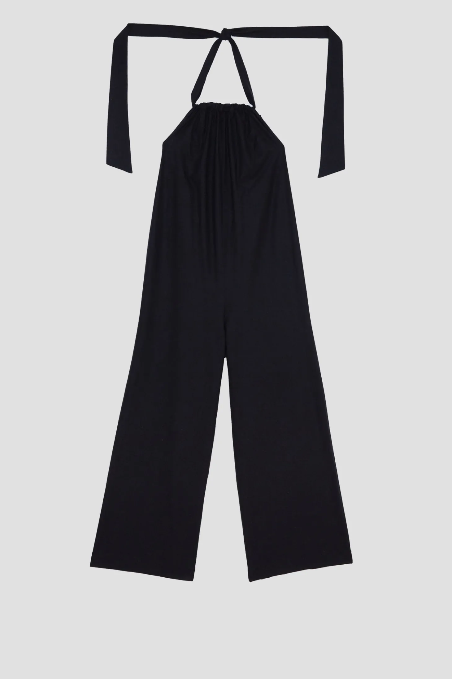 Rückenfreier Overall zum binden am Nacken. Mit extra breiten Bändeln beim Nacken und lange, welche sie um die Taille wickeln können. Die Hosenbeine sind weit geschnitten.